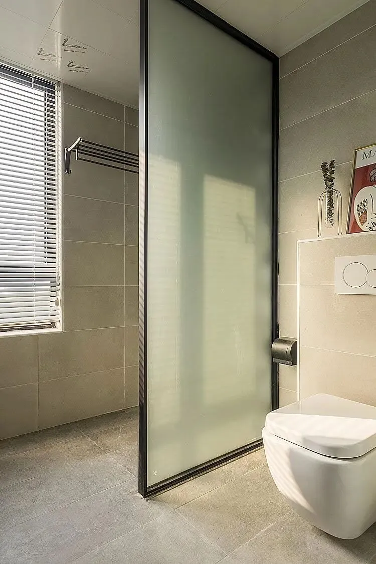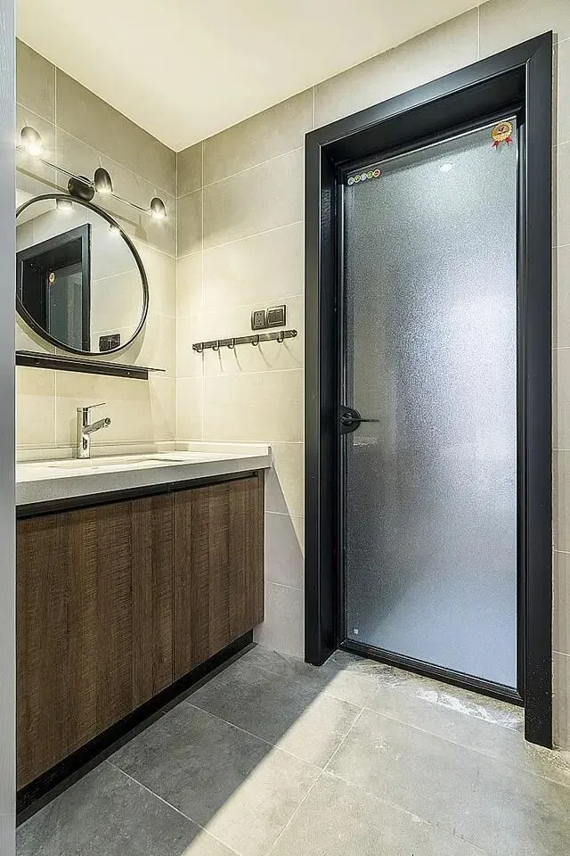 卫生间门安装了磨砂玻璃门,透光不透影,保证白天门口过道不必开灯。