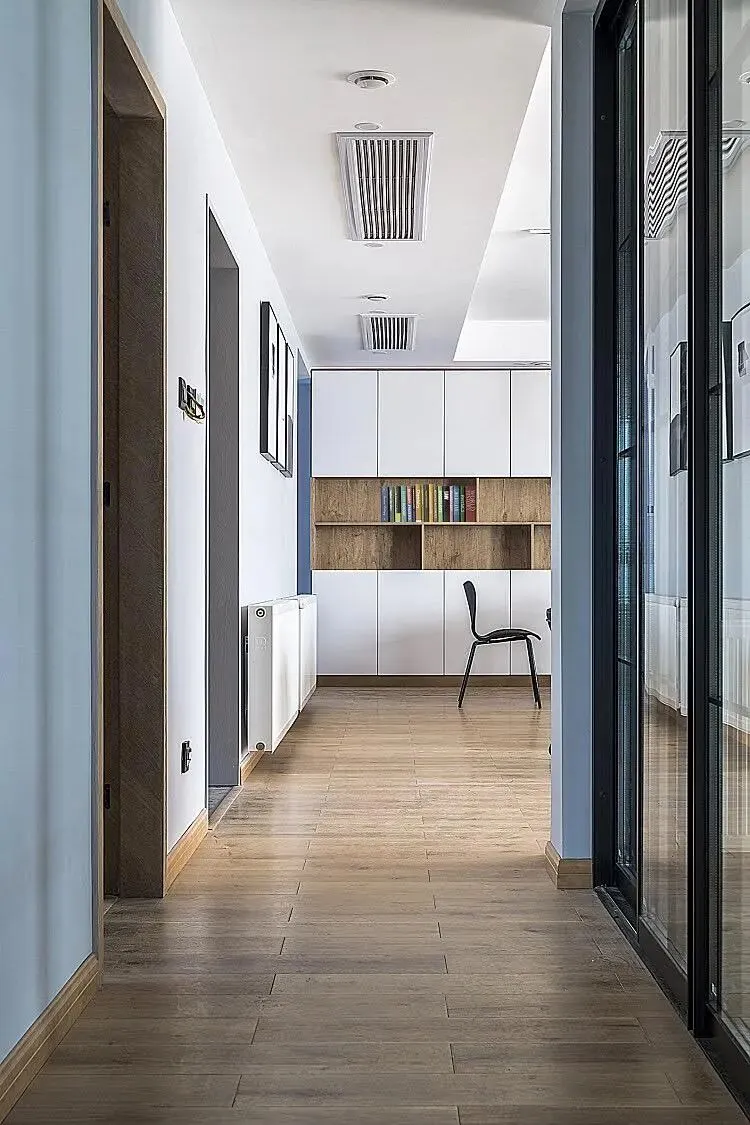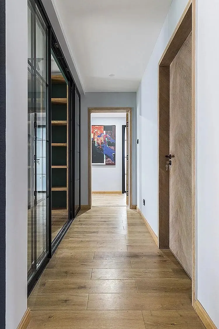 书房门最大化,和厨房门一样安装玻璃推拉门,保证过道白天尽可能的敞亮通透。
