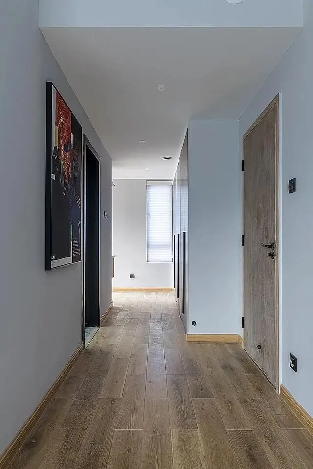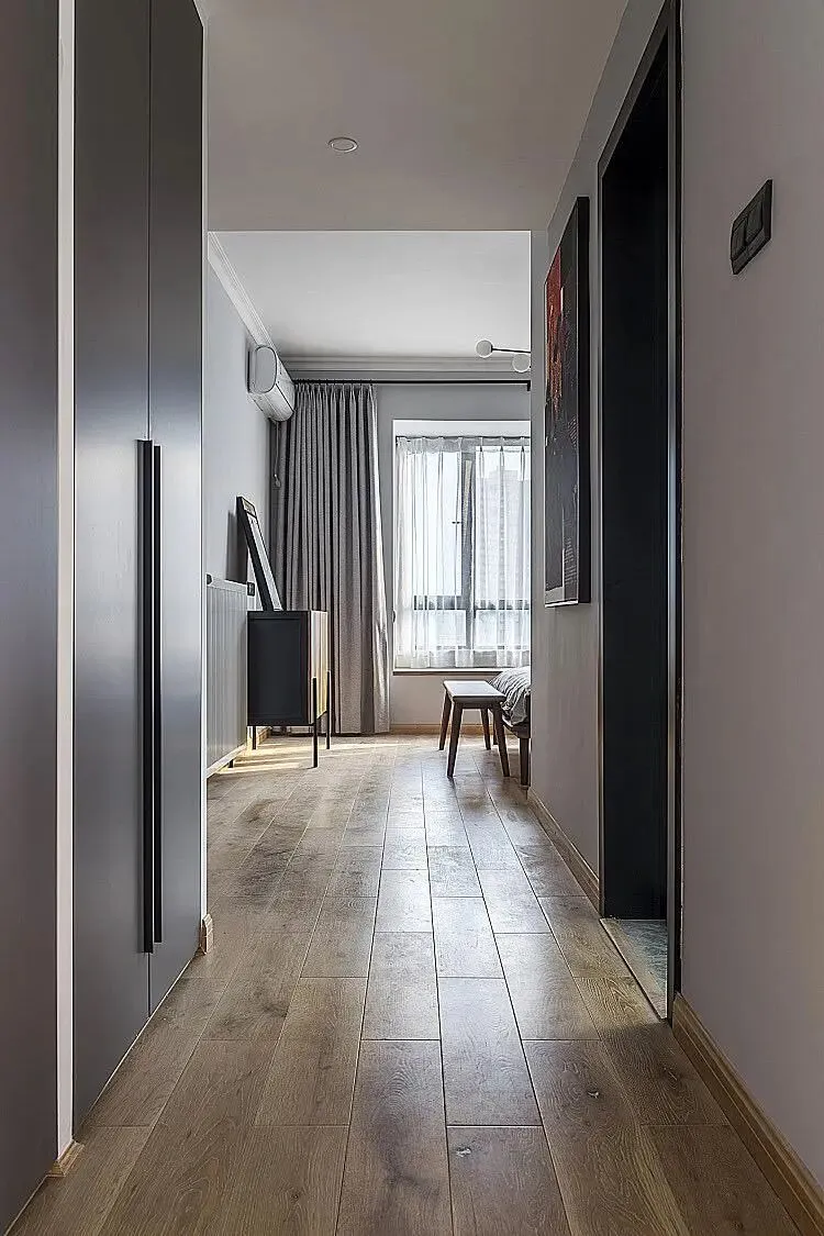 主卧的衣柜整体布置在过道的位置,一长排,储物功能很强大,柜子侧面也做了墙垛,恰好可以作为主卧安装门吸的区域,从视觉上也弱化了柜子侧面看的突兀感。