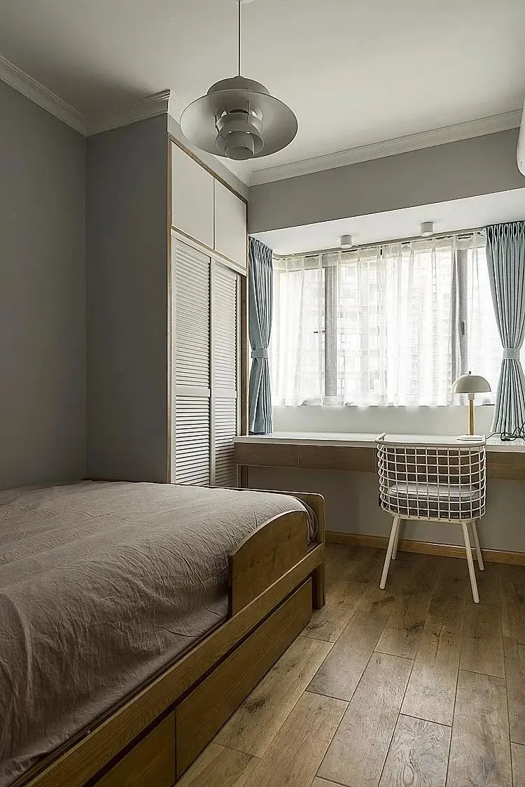 相比主卧色调更为素雅一些,浅灰色的床头背景墙和整个空间的融合度更好,尤其是打开床头的暖光灯之后,实在是太温馨啦!