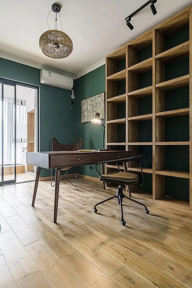 一改墙面整体的浅灰色,涂刷了复古的墨绿色乳胶漆,呈现一种自然、静谧的艺术气息,在这样的环境下办公,仿佛置身绿色身心,清爽舒适十分解压。