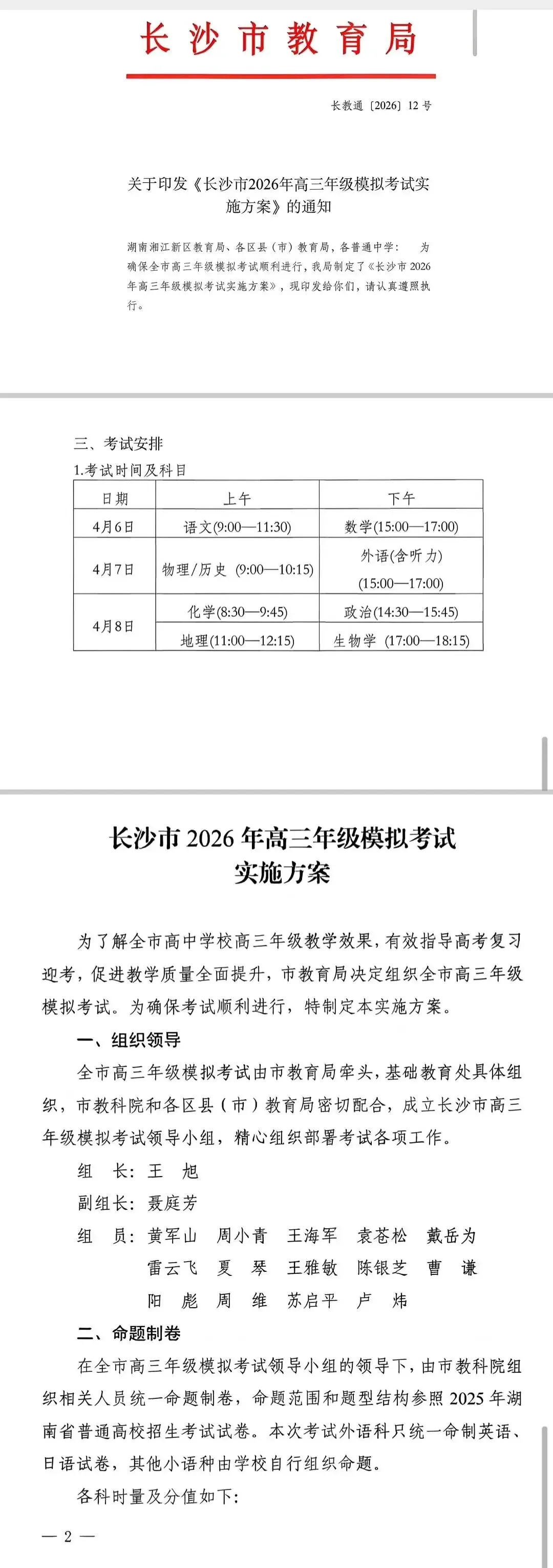 关于印发《长沙市2026届高三年级模拟考试实施方案》的通知