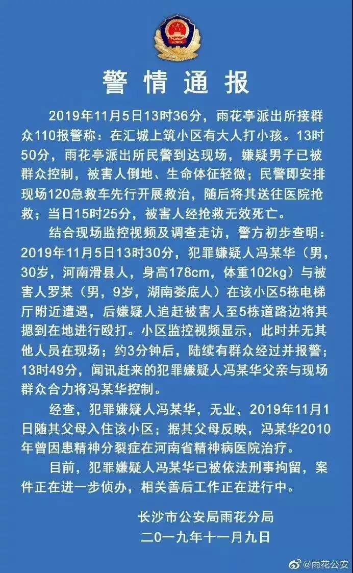 就在冯广行凶的两天前,11月3日,冯广还曾经一度在深夜10点失踪了,冯广的父亲甚至一度报了警,全家人找遍了火车站、橘子洲,甚至因为他爱钓鱼,还去了河沟里找,都没找到。直到第二天有好心人打电话给他,他才把儿子找回来。但这并没有引起他的警觉。业主群里有人责问物业、责问社区,为什么辖区里住着一位随时可能失控的精神病患者,而没有任何备案?社区负责人对媒体表示:“针对本市户籍的精神病患每年会安排四次随访,但是对于流动人口目前实施起来尚有困难。”当悲剧发生后,并非没有常识和教训可供普及和分享,比如湖南师范大学法学院法学教授、湖南省法学会程序法学研究会会长黄捷告诉本刊:“像这种正面发生的侵害和危险,其他人也好,受害人也好,受害人的近亲属也好,可以对他采取正当防卫的手段。正当防卫就是对他也造成一定伤害的手段,来停止这种危险和威胁。有一个‘紧急避险’的原则在这里可以适用,就是可以牺牲一个小的合法利益来保护更大的利益。因为当时情况紧急不晓得冯广的情况,那么采取一些措施都是法律允许的。”但是观点和经验易于分享,每个人心灵上的诘问却难以消除。当灾难过去一周,律师的观点证明“围观的人们确实没有责任”,评论家们说出“要更多地去鼓励那些见义勇为的人,而不是批评那些围观的人”的时候,发出1000字长信的小傅并没有迈过心中的坎。他拒绝了我的采访,“我现在静不下来,再去说什么,好像都是一种伤害”。当罪恶发生的时候,没有人是罪恶的一部分,可是人们距离罪恶又有多远呢?是一盒药物,一个登记簿,是10分钟,还是100米?那天唯一的介入有可能来自童童,在小路上走到一半,她用自己的电话手表给自己牵挂的朋友打去了一个电话。晚上回到家,她和妈妈说,电话里传来“啊,啊”的声音,她吓得赶快挂掉了。她的电话手表,之前每天和罗琪聊个不停,现在她总是不断拿起又慢慢放下,童辉希望女儿永远都不知道那两声意味着什么。(本文原载《三联生活周刊》2019年第46期,原标题为《长沙男童遇害案:无为之恶》,文中罗琪、童童、李莉、黄菊、冯广、潘浩为化名)