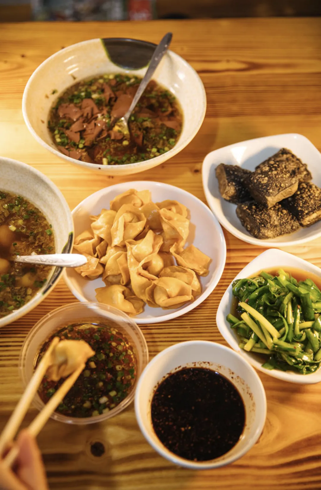 另一种吃法则是炸。说实话,我一直对炸物不感兴趣,总觉得油腻不清爽。没想到一盘炸得焦黄的馄饨上来后,我只尝了一口,便觉得很不错,馄饨皮焦脆,原本煮着吃并不明显的肉馅,炸完后蛮劲道,而且并不是想象中那么油乎乎。为了解腻,与炸馄饨搭配的还有酱油水,是拌了辣椒的,蘸着吃也不算辣,还能提味道。凌志示意我们将馄饨放酱油水里泡一会儿再吃,原本担心会不脆,没想到饱蘸了酱油水的馄饨别有一番风味。