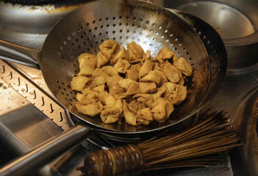 可别把炸馄饨想得那么简单。我在厨房里围观了凌志炸馄饨,他告诉我,馄饨包好要先冻上,这样不容易糊。馄饨进了油锅,像一群鱼跃入了水里,起初锅里很平静,慢慢油泡就起来了,越来越小。凌志说,要根据馄饨的颜色判断要不要继续升温,至于怎么判断,则全靠厨师的经验。馄饨皮薄,容易变色,要想馅炸透,就得不停地翻。凌志拿着笊篱,将馄饨从一边推到另一边,有时还会将锅从灶上端下来,以防止温度太高炸过了。凌志操作得小心翼翼,我在旁边看得大气不敢出,一锅馄饨炸下来,需要十多分钟,实在不容小看。