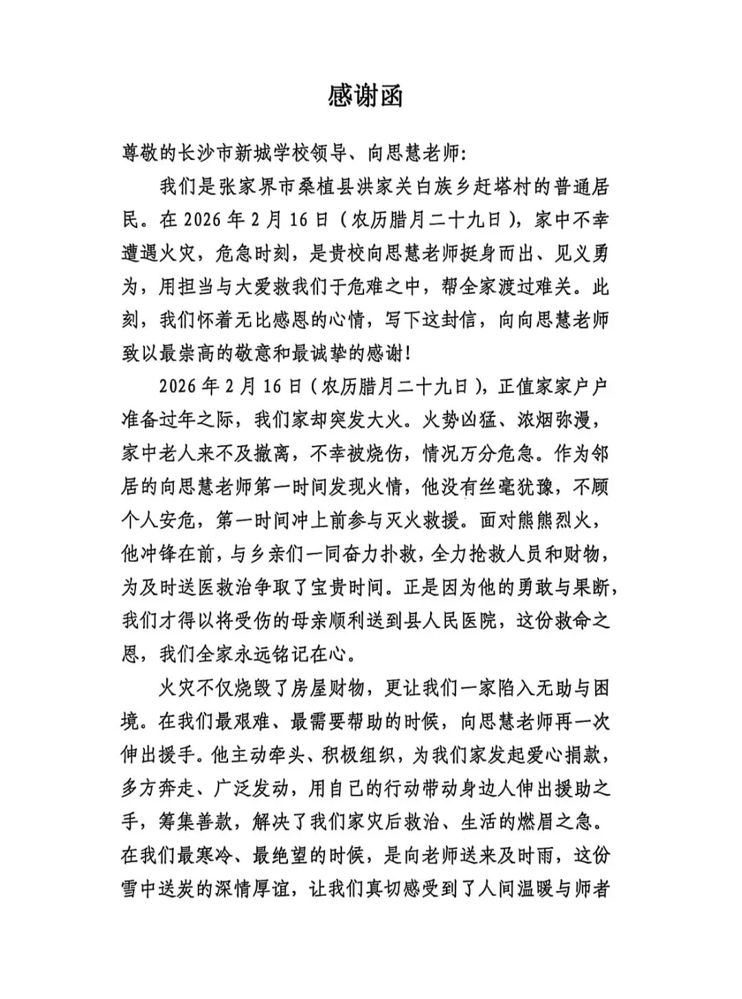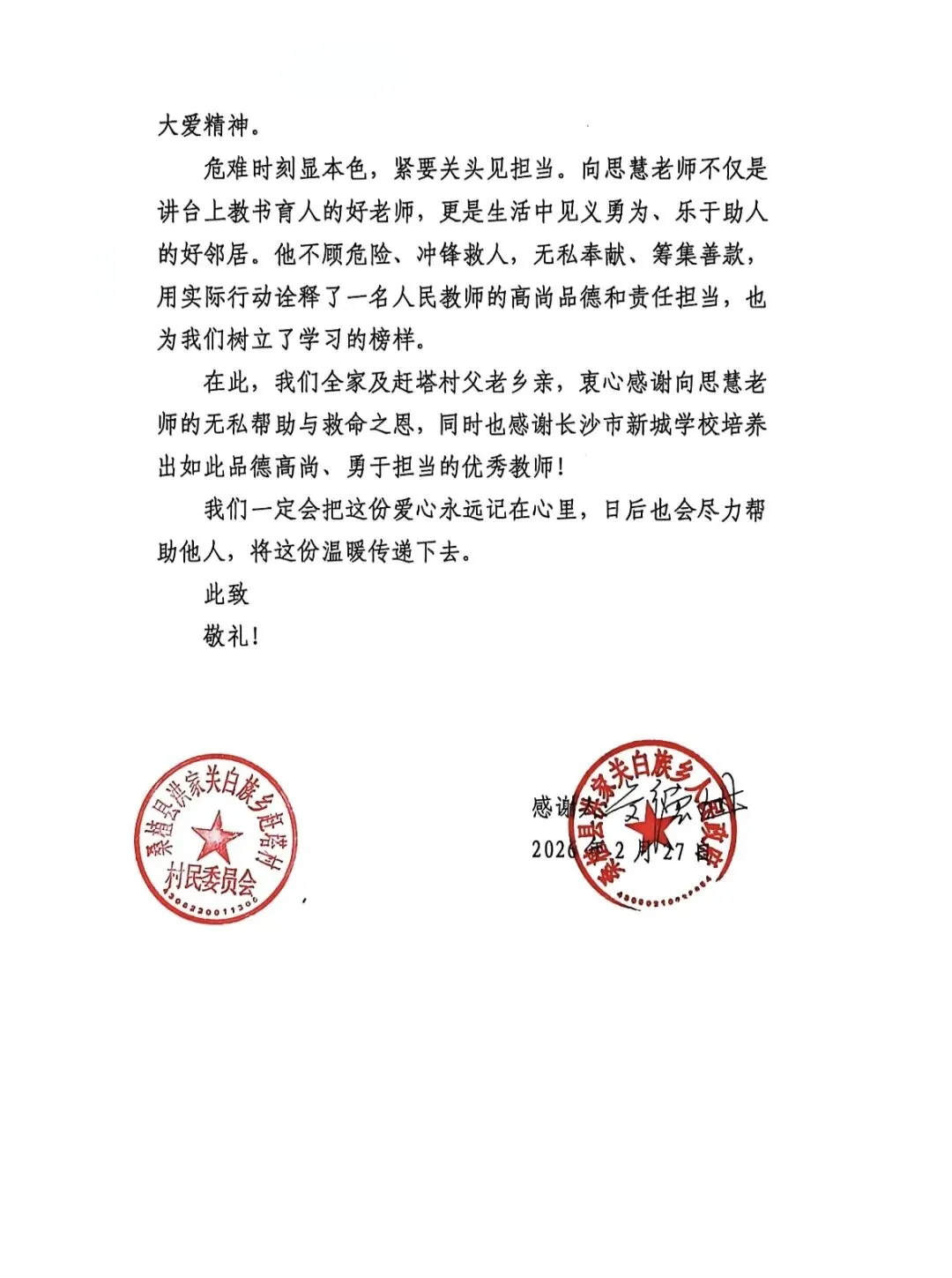 一封来自山村的感谢函,近日发送到长沙市新城学校:“衷心感谢向思慧老师的无私帮助与救命之恩,同时也感谢长沙市新城学校培养出如此品德高尚、勇于担当的优秀教师!我们一定会把这份爱心永远记在心里,日后也会尽力帮助他人,将这份温暖传递下去。”这封感谢函,不仅是对向思慧个人的褒奖,更是对长沙市新城学校师德师风建设的肯定。