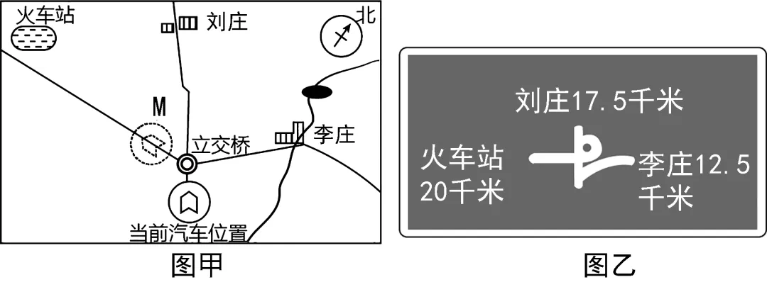 5. 小明乘汽车到达立交桥,看见一个路标(图乙),他对上面地图的判断,错误的是()