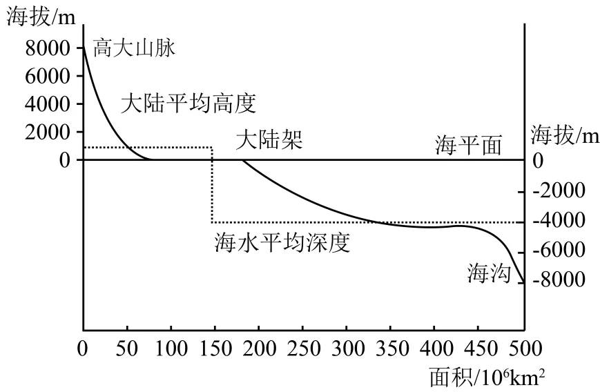 下图为地球表面海陆起伏曲线示意图,横坐标表示地球不同高度地区的面积。世界最高的山峰岩面海拔8848.86米,最深的海沟深11034.38米,读图完成下面小题。