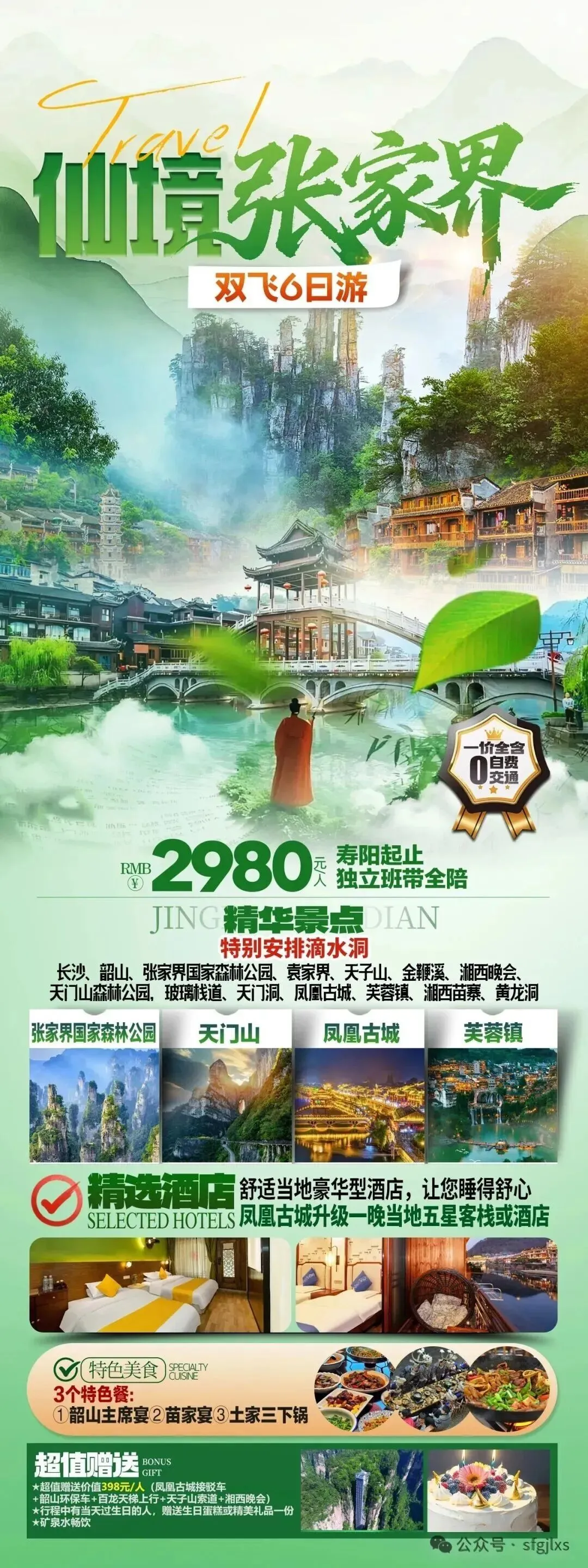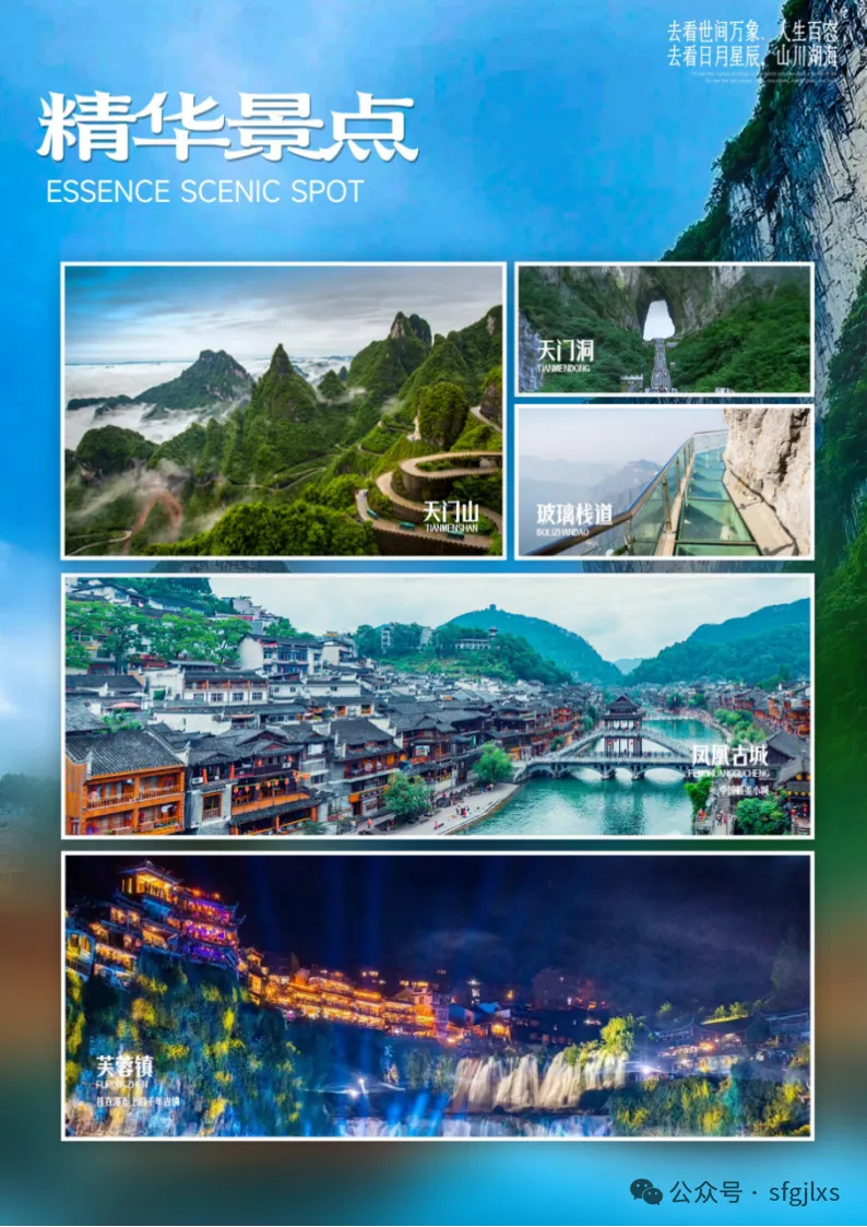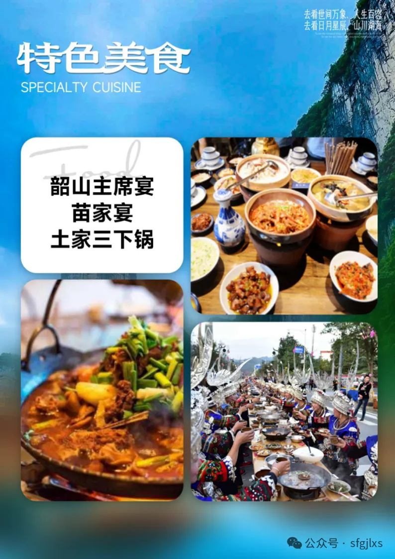 酒店早餐后游览曾被新西兰著名作家路易艾黎称赞为中国最美丽的小城--【凤凰古城AAAAA,赠送凤凰古城接驳车28元/人,不含九景门票】游览漫步沱江感受凤凰晨景,晚上看到凤凰的灯火辉煌,灯红酒绿,清晨静享这座小镇带来的心灵洗涤,感受雾漫沱江的美轮美奂(备注:凤凰古城新政策,进古城不需门票,如游览凤凰古城内九景,沈从文故居、熊稀龄故居、杨家祠堂、沱江泛舟、东门城楼、虹桥艺术楼、崇德堂、万寿宫、古城博物馆等景点需另行付费148元/人,此报价不含凤凰古城九景门票,导游不能带领客人游览,客人自行逛古城,自行游览)凤凰古城位于湖南湘西,为中国历史文化名城,素有“中国最美丽的小城”之美誉。古城依山伴水,人杰地灵,沱江穿城而过,民族氛围浓厚,名胜古迹甚多凤凰古城核心九景外展古城的形与体,内释古城文化的根与魂,是凤凰古城内唯一能代表凤凰千年兵商之城的核心景区,亦是打开湘西边城历史大门的唯一钥匙。白天听古城的“翠翠”讲唯美动人的爱情故事,到沈从文故居了解璀璨的湖湘文化,逛崇德堂领略湘西财富传奇,进总理府感悟熊凤凰心忧天下,玩泛舟沱江看原汁原味吊脚楼群。沿沱江两岸漫步、欣赏悠悠沱江水,翩翩吊脚楼,漫步凤凰古城民族风情工艺品一条街,在古城内可免费品尝着沁人心脾的苗家姜糖,深入了解中国非物质文化遗产-----苗银纯手工锻造技艺;一种远离尘世的感觉悠然而生;一幅江南水乡的画面便展现于眼前,这一切都使人留连忘返。后乘BUS前往宋祖英的家乡古丈县(全程高速约2小时左右)大湘西地区最大、最美丽、民俗风情最浓郁的古朴苗寨—【湘西苗寨】(门票已含)这里是原始生苗人的古老聚居地。古苗人的巫傩神技更让你瞠目结舌。对了歌、喝了酒、击完鼓,才能走进这个原始神秘的古苗寨,“竿子营”营房、烽火台流淌着历史的沧桑、苗族人的家国情怀、民族大义;去茶农家里品鉴最好的“有机茶”—“古丈毛尖”;打上了08奥运开幕式的墨戎“四方鼓舞”,会让您感受到战神蚩尤出征的震撼,秋实丰收的喜悦;精彩绝伦的各种苗族手工纺织、锻制技艺让人叹为观止;神秘的湘西巫术更会让您瞠目结舌、目瞪口呆……跳完竹竿摆手舞,就可以去体验苗家寨子里待客的最高礼遇—“长龙宴”了,那些热情的姑娘,一定要您对上苗家山歌之后,才会奉上筷子,让您来品尝宋祖英家乡的美味—【苗家长龙宴】“长龙宴”湘西苗寨长拢宴是苗族宴席的中最高接待仪式。通常用于用于接亲嫁女、满月酒以及村寨联谊宴饮活动。BUS赴穿越王村大瀑布游览具有两千多年历史文化的千年古镇—【芙蓉镇】(含芙蓉镇景区门票费用已含)芙蓉镇景区,【土王桥】、【溪州铜柱】、【五里石板街】芙蓉镇是中国唯一一处具有3千年历史且繁荣至今的古镇——王村,又是融自然景色与古朴的民族风情为一体的旅游胜地,比凤凰古城的历史至少早2500年,也是电影拍摄基地,后因刘晓庆拍摄电影《芙蓉镇》而改名,品尝刘晓庆米豆腐。【芙蓉镇大瀑布】——缔造瀑布上的千年古镇瀑布是芙蓉镇的天然美景,任何到芙蓉镇的人都必到瀑布。芙蓉镇三面环水,瀑布穿镇而过,别有洞天。这是湘西醉大醉壮观的一道瀑布,高60米,宽40米,分两级从悬崖上倾泻而下,声势浩大,方圆十里都可听见。春夏水涨,急流直下,飞虹相映,五彩纷呈。“挂在瀑布上的千年古镇”由此得名。有诗赞曰:“动地惊天响如雷,凭空飞坠雪千堆,银河浩瀚从天落,万斛珍珠处处飞。夜间活动项目介绍:后观看张家界大型民俗歌舞晚会(门票普座220元/人必消费用已含)中国非物质文化遗产展演基地,创于2004年3月,始终以:“非遗的传承、原始的再现”为核心,把隐匿民间艺术奇葩呈现世界。“民族的才是世界的”,自成立以来,始终以国家级非物质文化遗产展现湘西原始的神秘离奇文化。在此让您探寻屈原笔下诡异的楚风遗俗、湘西巫术!!(不看不退费,因场次人数等限制有权互换赠送【张家界千古情】,如停演期间无法观看,费用不去不退)