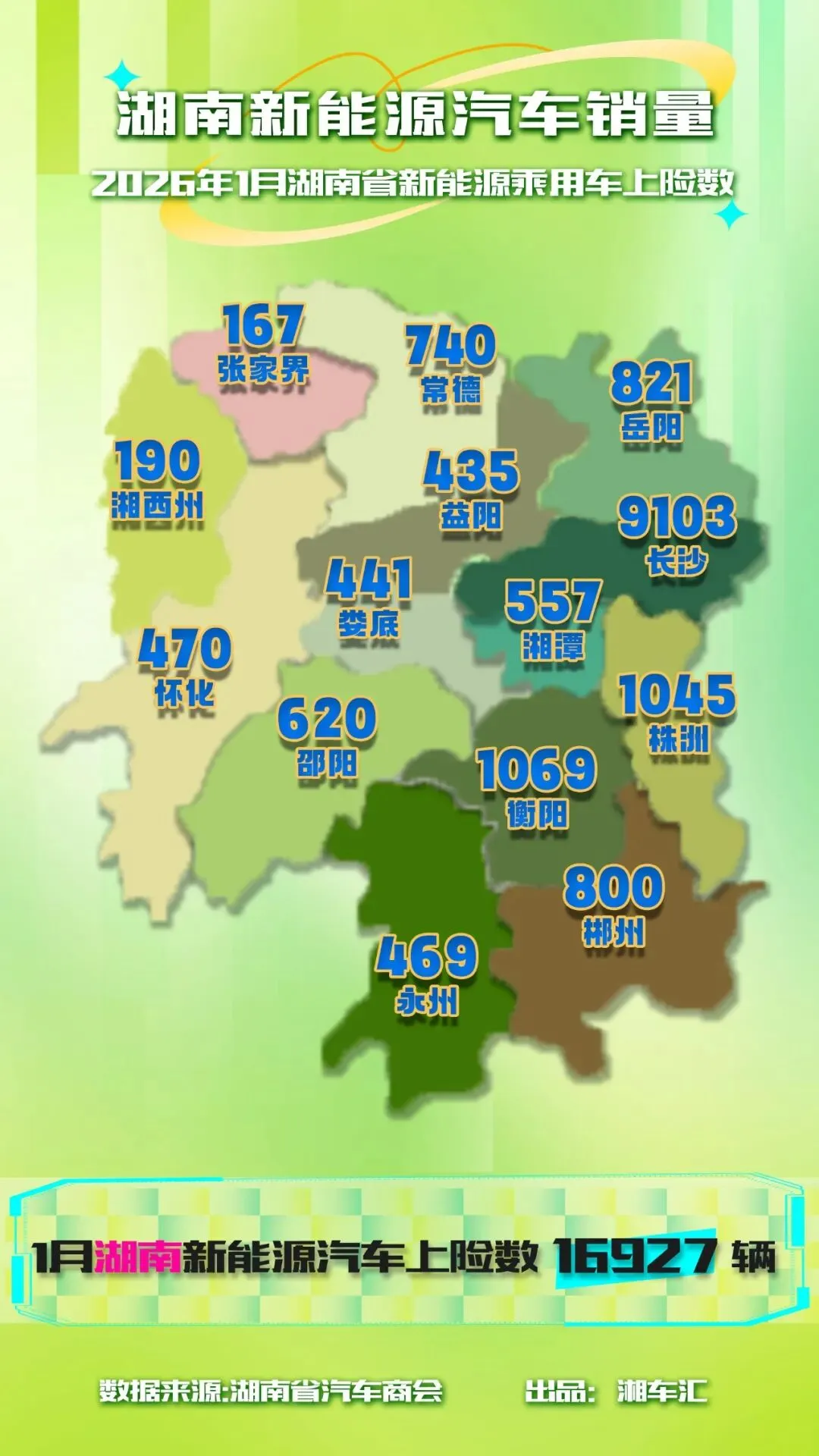 湖南省汽车商会最新数据显示,2026年1月全省新能源乘用车上险总量达16,927辆,实现新年平稳开局。其中,省会长沙以9,103辆的销量强势领跑,占全省总量的53.8%,以一城之力贡献过半销量,继续巩固其新能源消费核心地位。