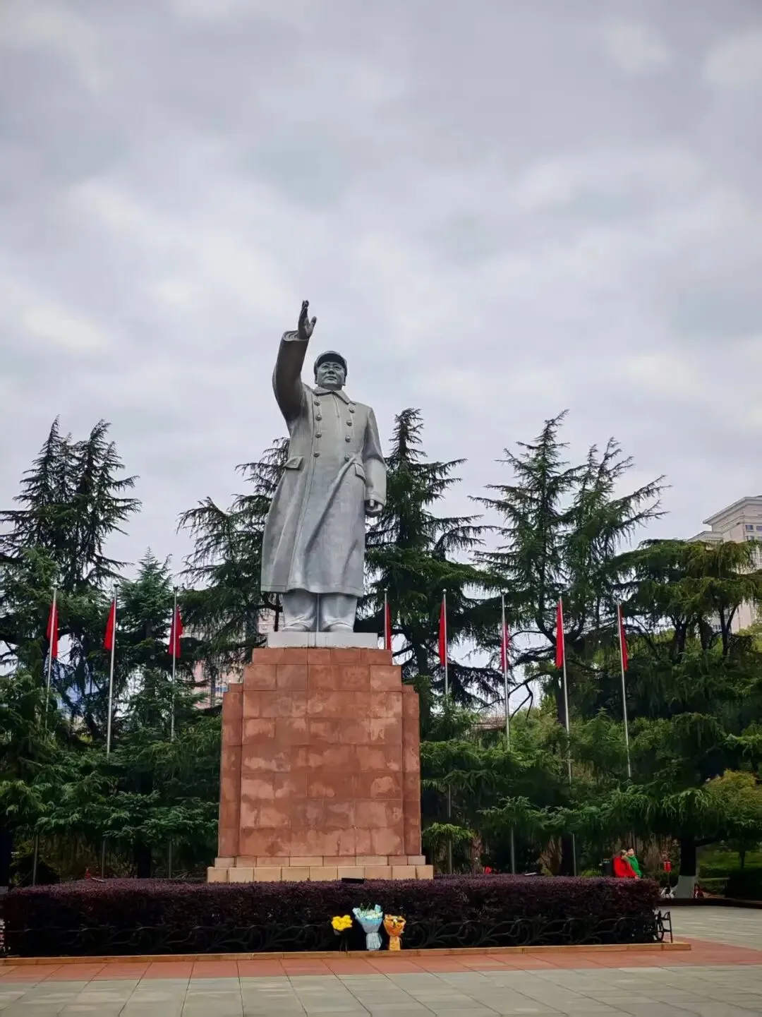 毛主席雕像高32米,长83米,宽41米,寓意着毛主席当年32岁,享年83岁 ,执政41年。32岁的毛主席“恰同学少年,风华正茂”,留着飘逸的长发,目光深邃,气宇轩昂。有一种心忧天下,豪情满怀的气质。雕像面朝东南,注视着太阳升起的方向,凝望着那片为革命奋斗过的热土。整个雕像采用的是“永定红”的花岗岩,寓意着江山永定。穿过望江亭,来到问天台,这里是毛主席指点江山的地方,眼前的美景一览无余,橘子洲上种植的橘树大约有300多个品种,郁郁葱葱。