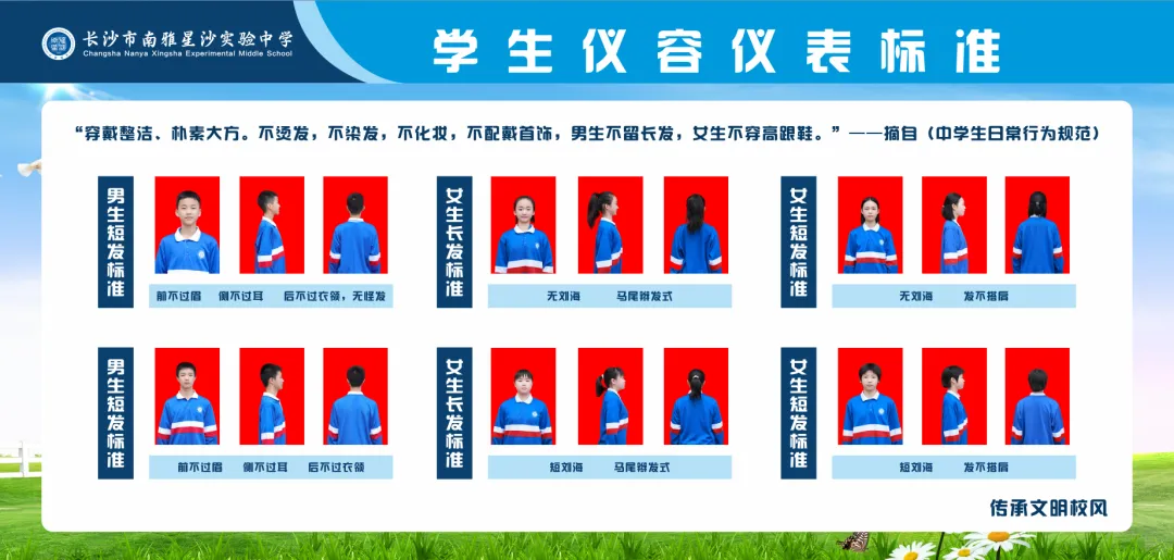 1、仪容仪表:在校期间,建议所有同学穿着全套校服,不得私自对校服进行裁剪,涂鸦。男生留短发,前不过眉,侧不盖耳,后不搭衣领;女生刘海不遮眉,两鬓不遮脸,不能披发,长发应束发,建议留短发。所有学生不得染发、烫发、留怪发。学生一律不允许化妆,留长指甲、染指甲,打耳洞,严禁佩戴首饰等等。不符合上述要求的同学,请各位家长在3月4日开学报到前自行整改到位。