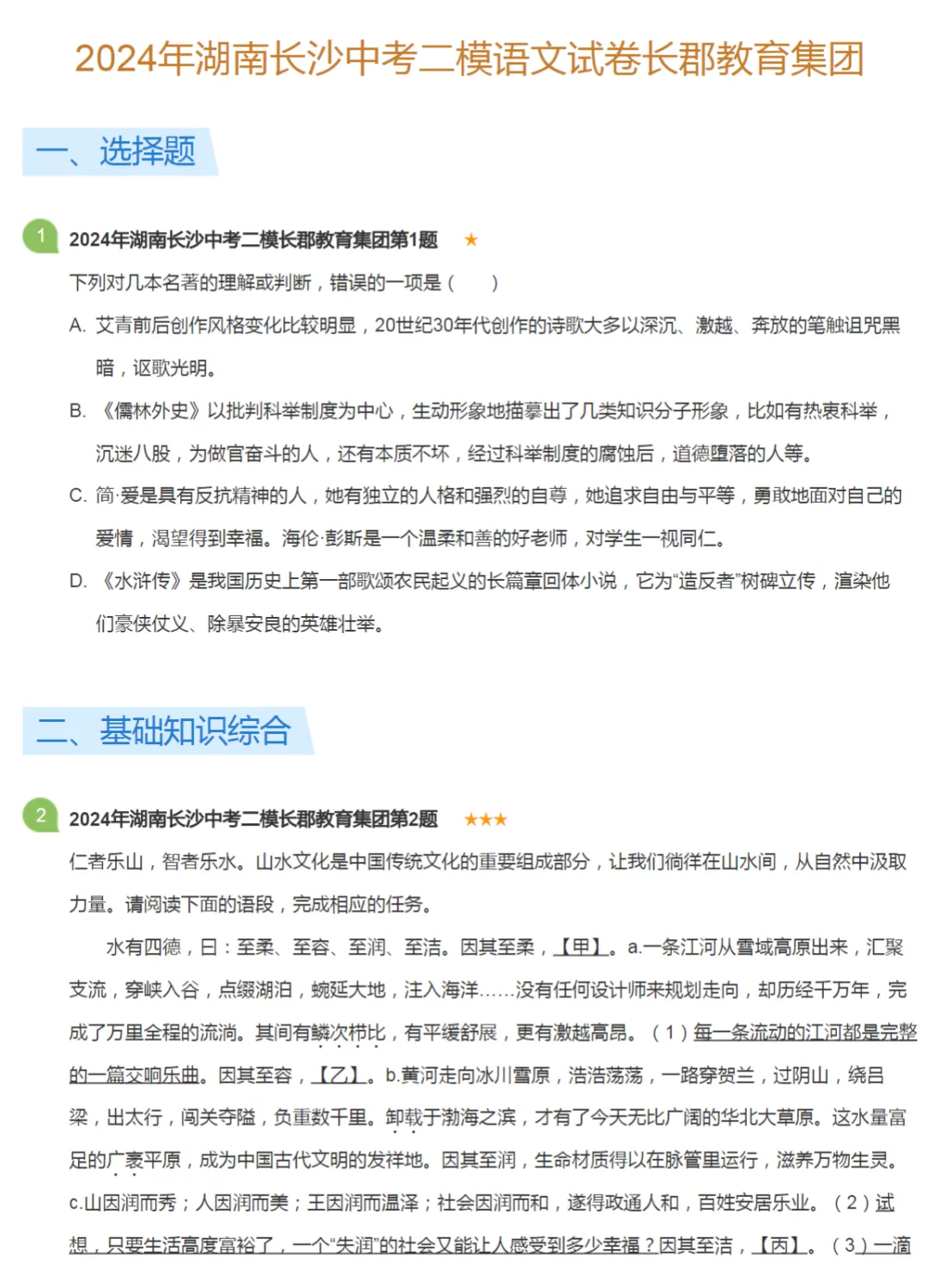 2015-2024学年湖南长沙中考二模语文真题及答案解析