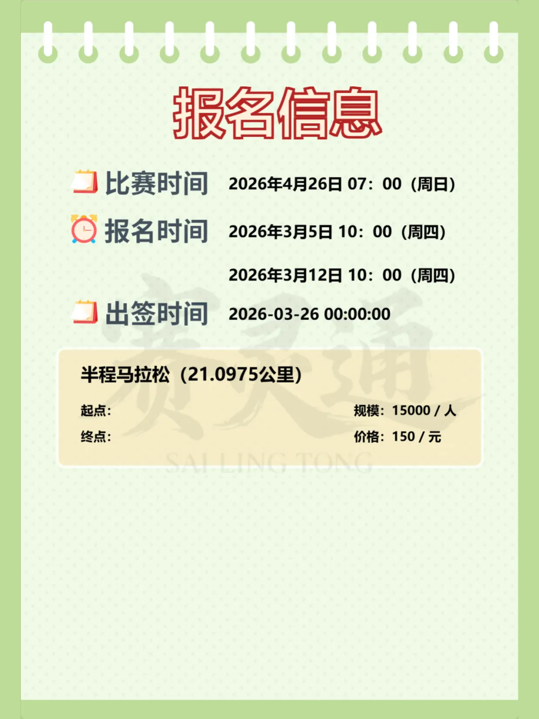 2026湘江半程马拉松报名将于3月5日10:00开始,持续至3月12日10:00.比赛定于4月26日在长沙举行,设男女半程马拉松项目,限15000人参赛.报名者需年满18岁,健康状况良好,并有相关跑步经验.资格可能通过抽签获取