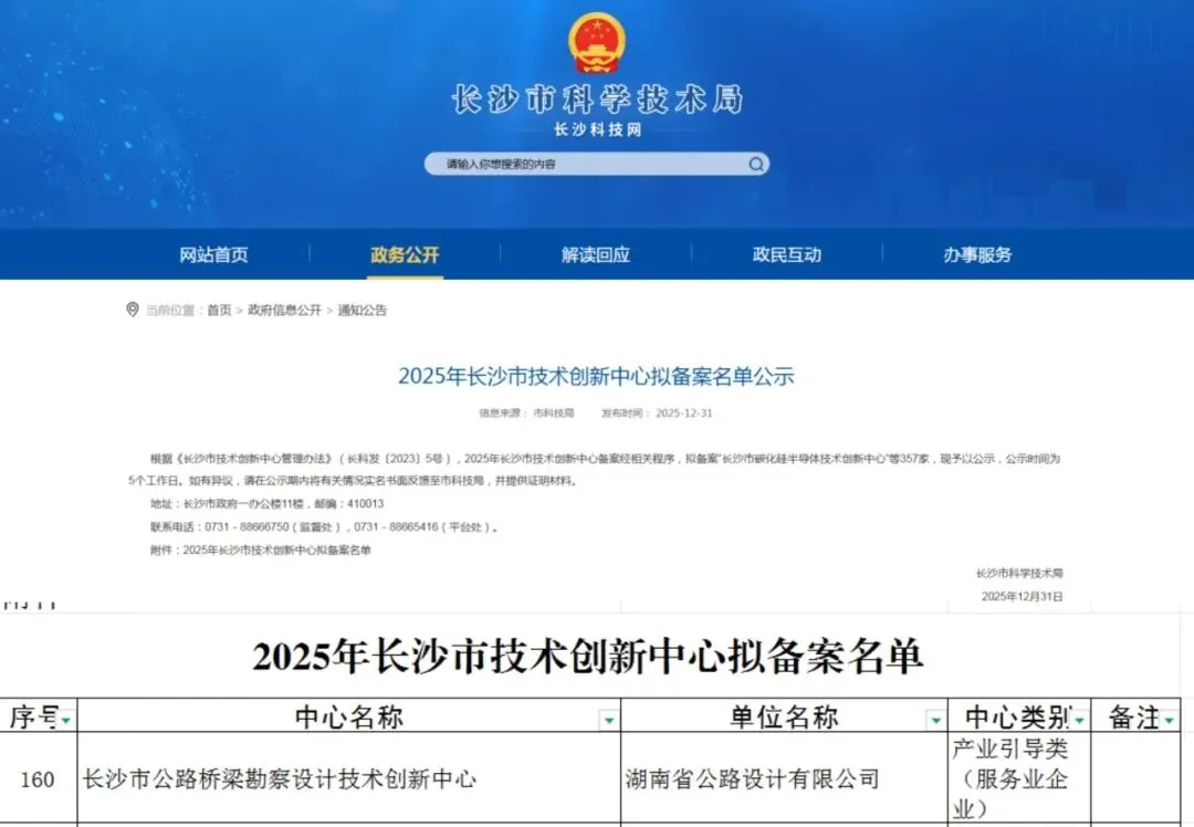 长沙市技术创新中心、湖南省工程技术研究中心认定,是落实“三高四新”战略定位、推进全球研发中心城市建设的关键举措,重点面向工业、建筑业、服务业三大领域,培育一批引领产业升级的产业引导类创新平台。此次湖南公路院成功获批,是公司科技创新平台建设的重大突破,标志着企业在公路桥梁勘察设计领域的技术创新实力获得市级权威认证。同时,是对企业三十余年深耕公路桥梁勘察设计领域、技术积淀深厚的高度肯定,意味着公司将深度融入长沙市科技创新主阵地,肩负起关键技术攻关、成果转化应用的重要使命。