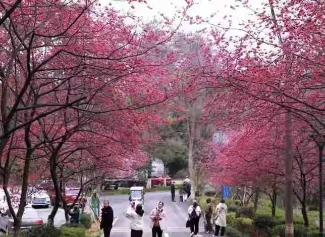 春风拂过,枝头樱花如云似雪,长沙天际岭省植物园樱桃湖,
