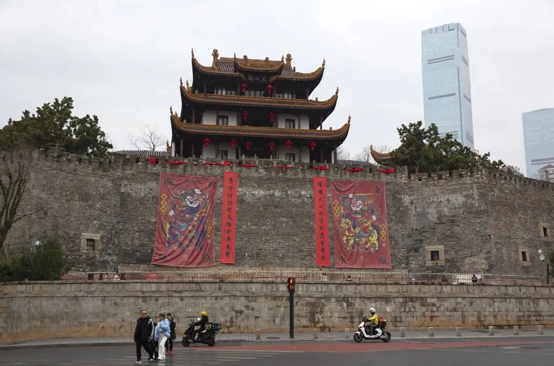 天心阁的城墙上,串串红灯笼在风里轻轻晃着。今年的古城墙上挂着巨幅春联。