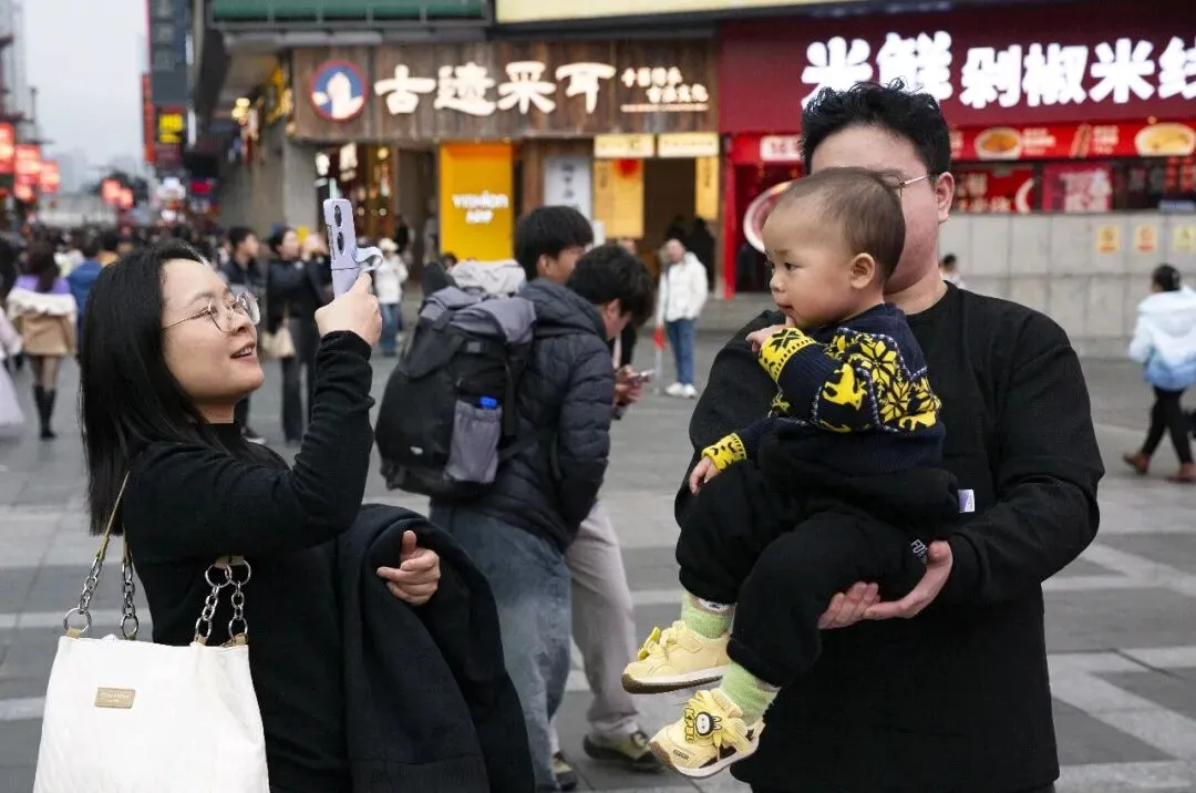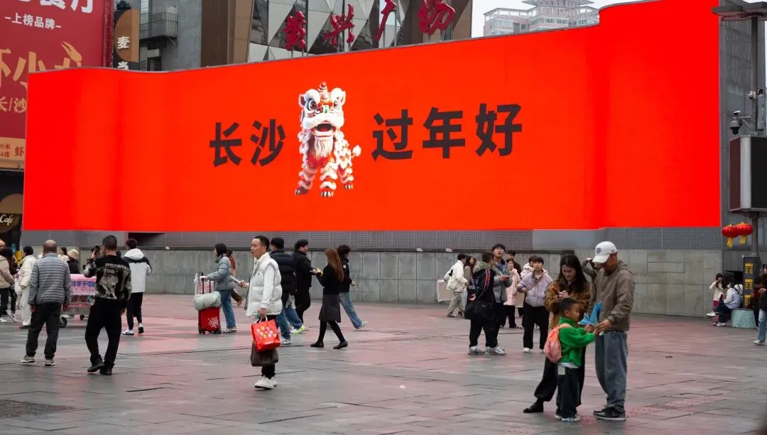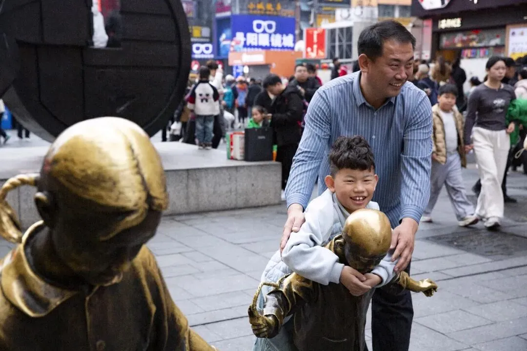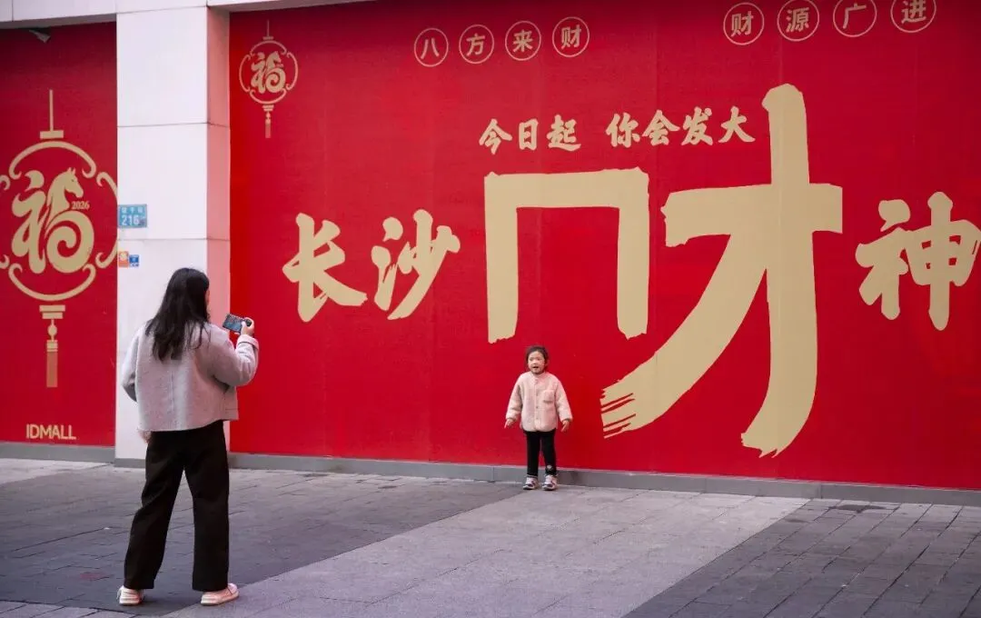 2026年2月11日,喜庆、应时应景的春联“登”上天心阁古城墙。与长沙的地标建筑,相互映衬,营造出极具视觉冲击力的新春景观,将春节的“仪式感”拉满。黄兴广场,电子屏幕上展示的“长沙过年好”,为2026新年增添喜庆色彩。坡子街的巨幅电子显示屏,新年祝福语,把整条街映成红色。河北游客在铜像前玩耍,父子俩开心体验长沙的民俗文化。