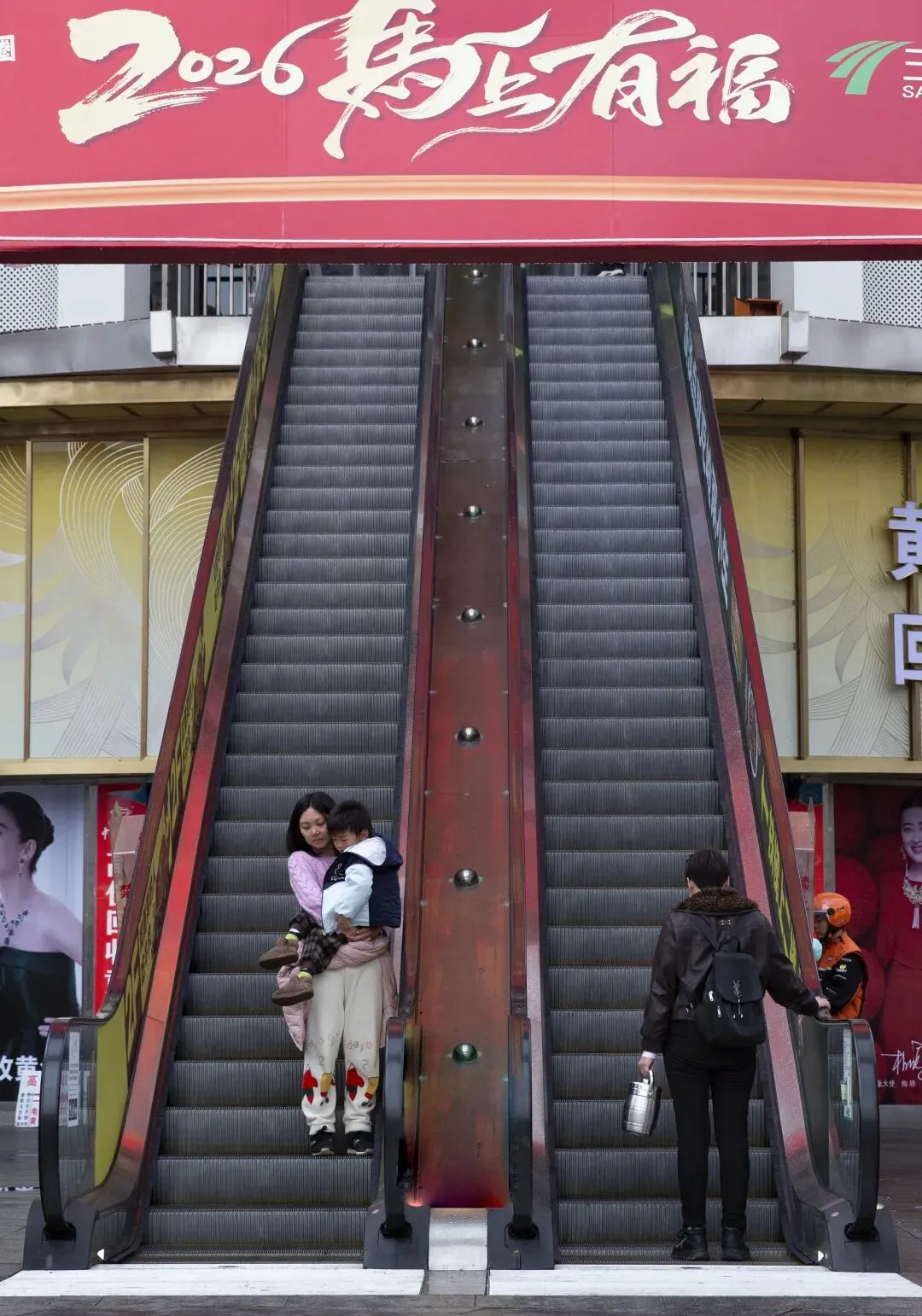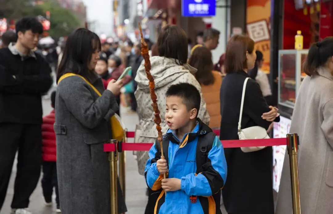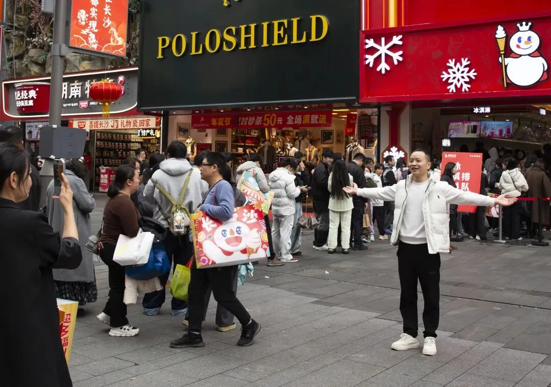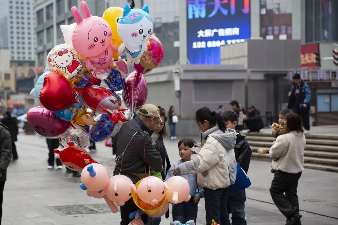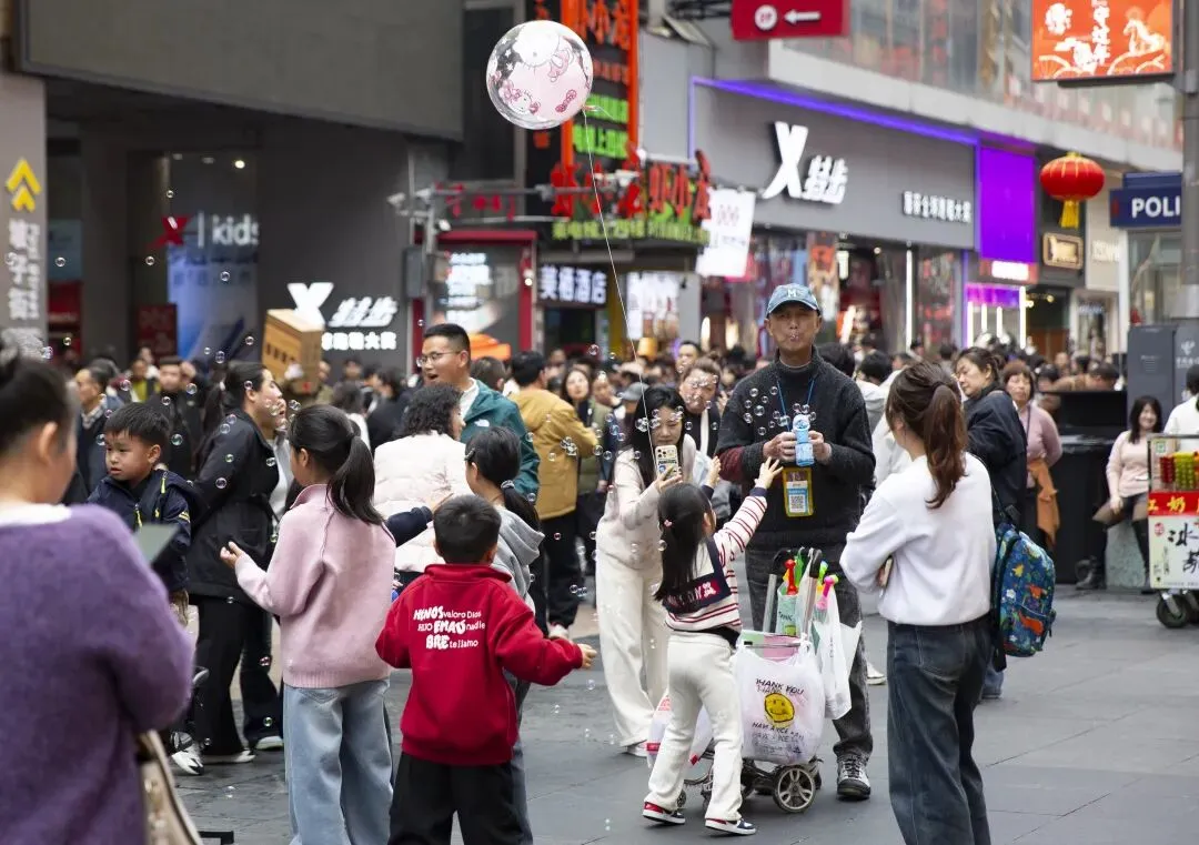 黄兴路上人潮涌动。步行街口搭起了新春牌楼,红色的“春”字格外醒目。人流里,一个卖气球的商贩被孩子们围住,五彩的气球在风中摇曳。