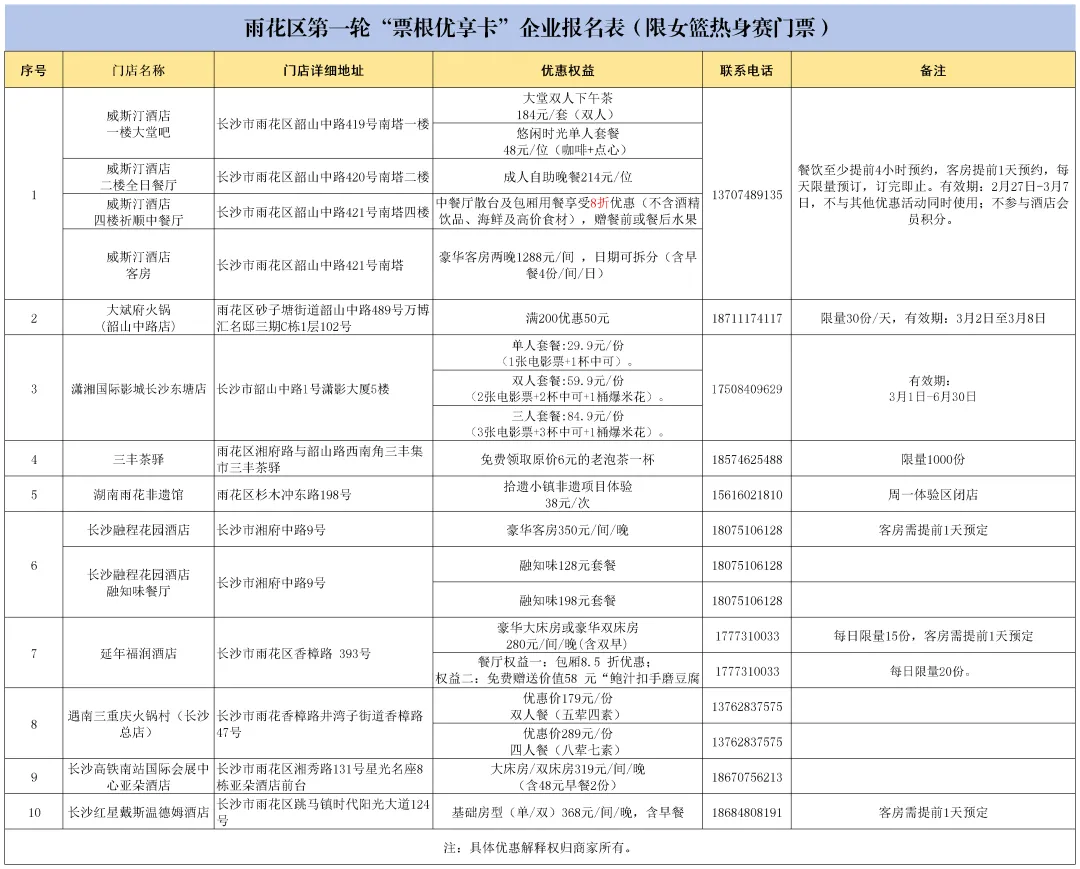 据悉,雨花区商务局联合了众多商家为球迷送上诚意满满的“票根优享卡”。无论你是远道而来的铁杆球迷,还是本地观赛的市民,只要手持女篮热身赛门票,就能在雨花开启一场“观赛+逛吃”的快乐时光。