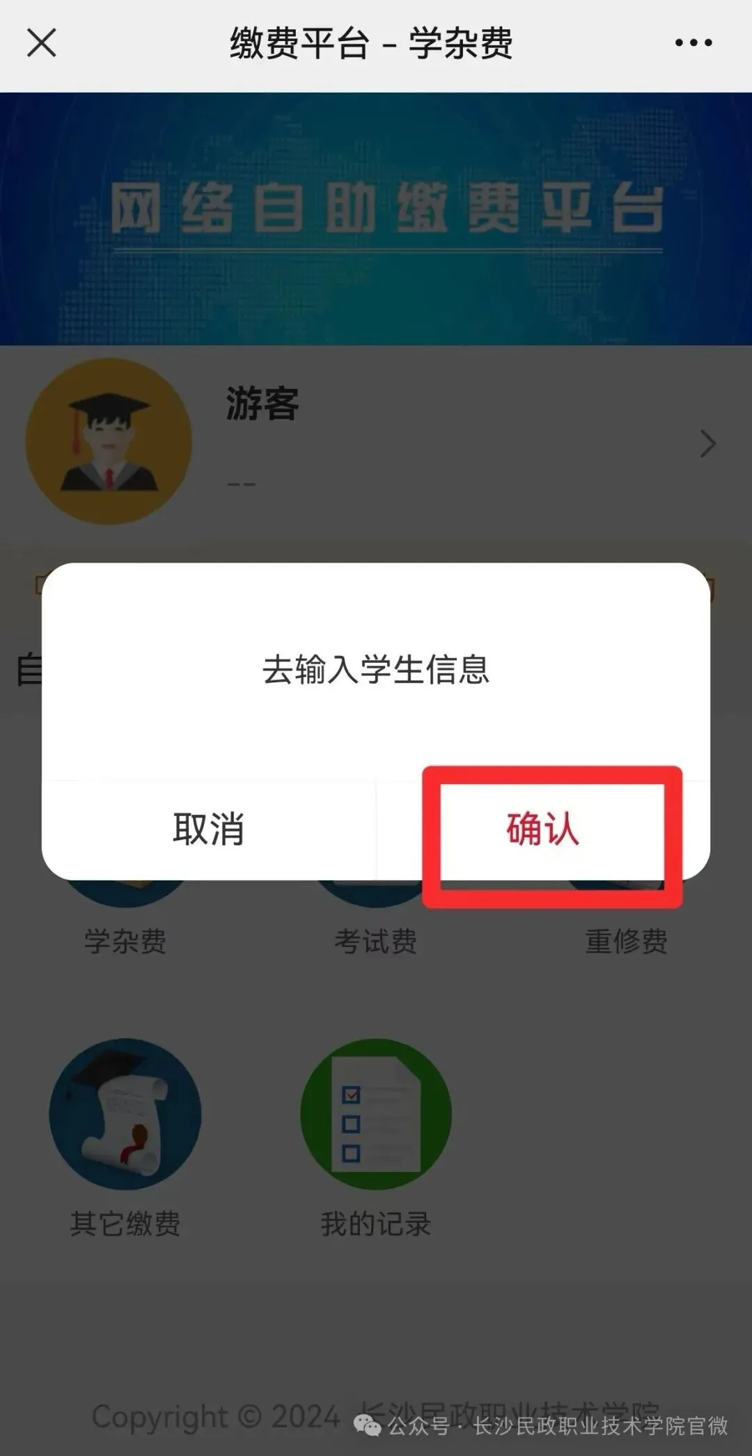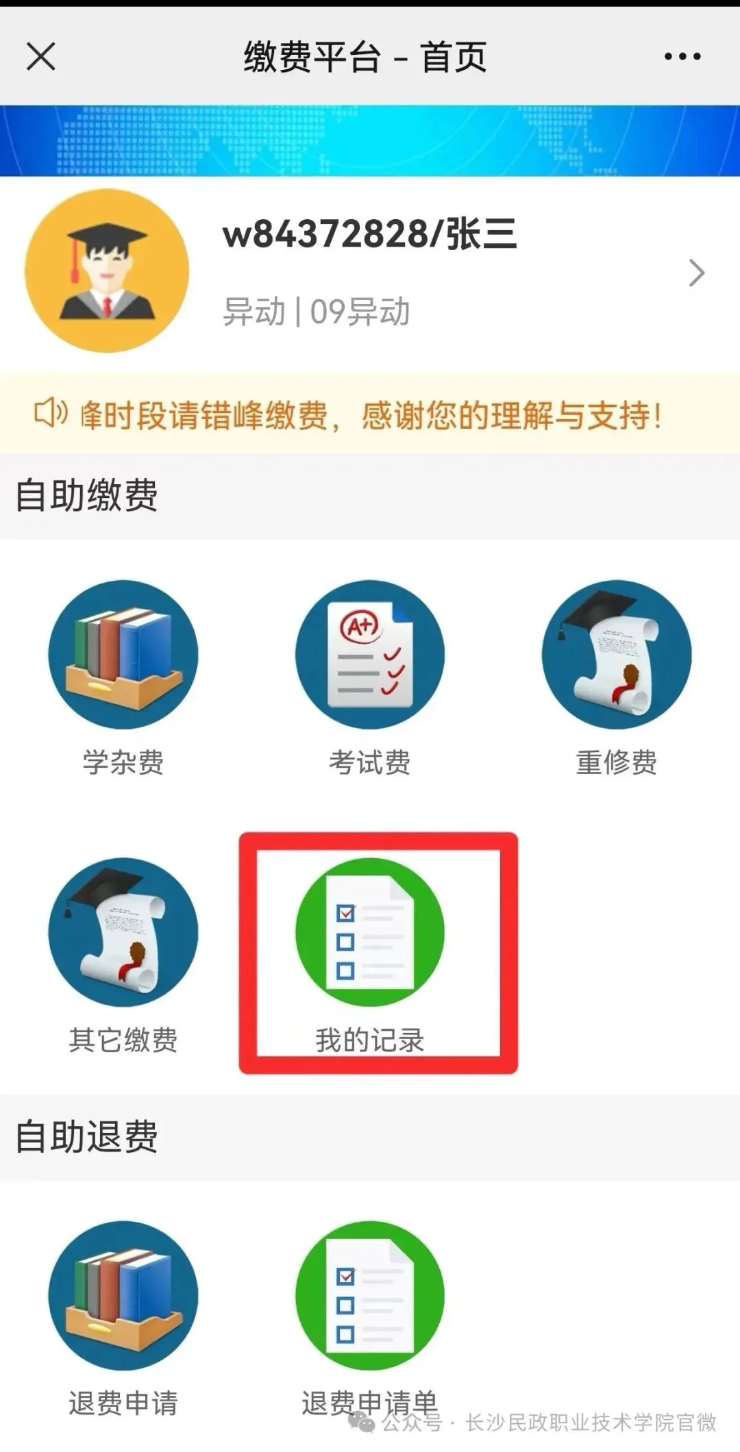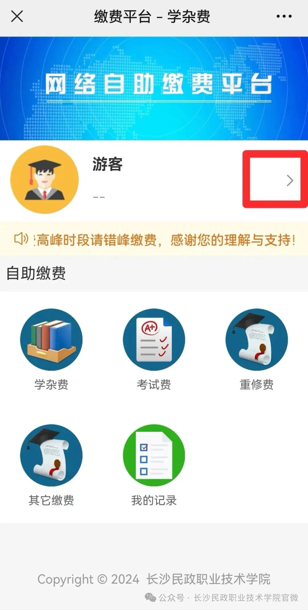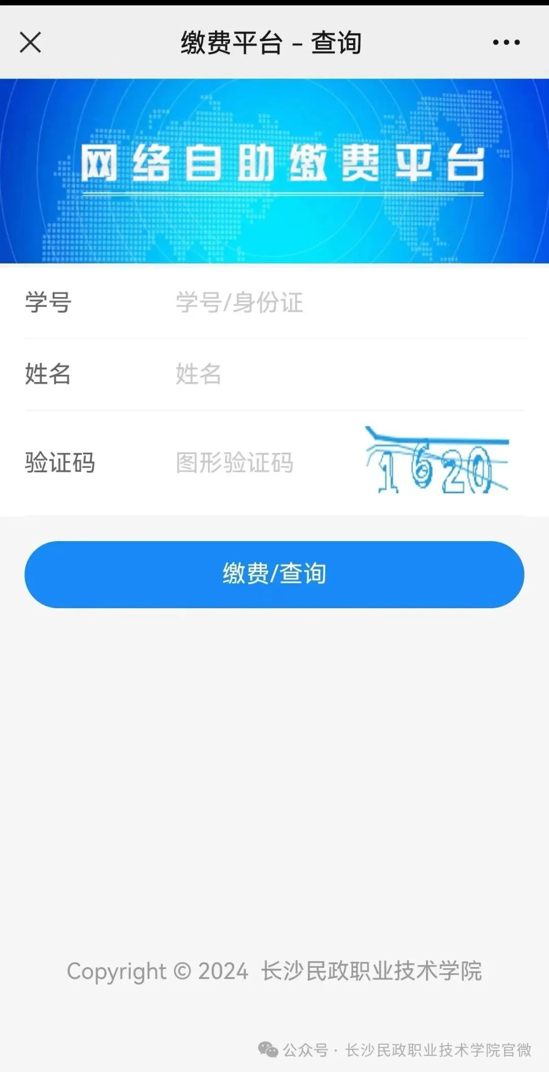 1.学生可扫码关注“长沙民政职业技术学院官微”微信公众号,在公众号页面,点击下方的“信息服务”中的“缴费平台”菜单,进入缴费登录页面。点击箭头,输入身份证号、姓名、验证码,登录主页面。