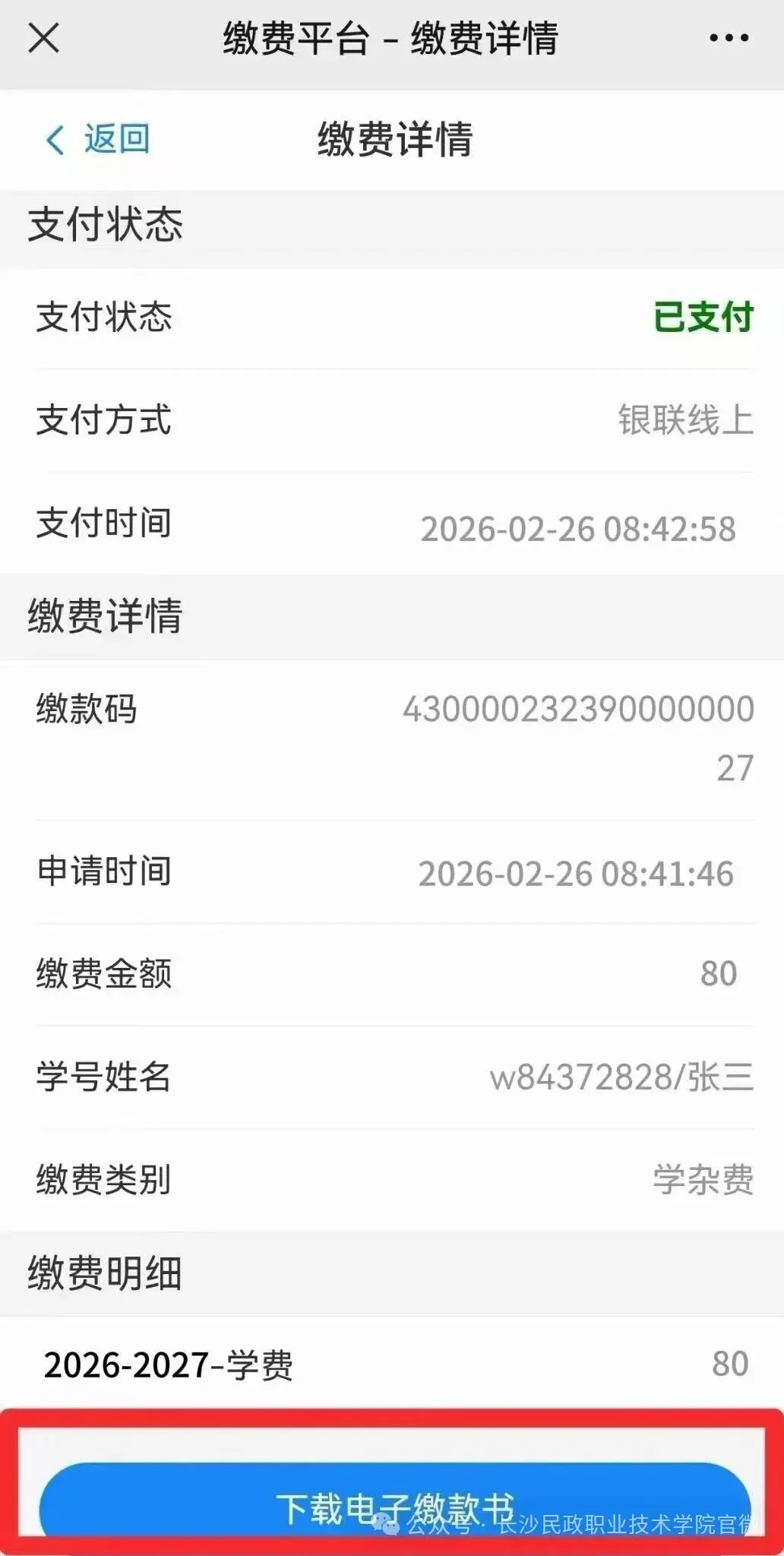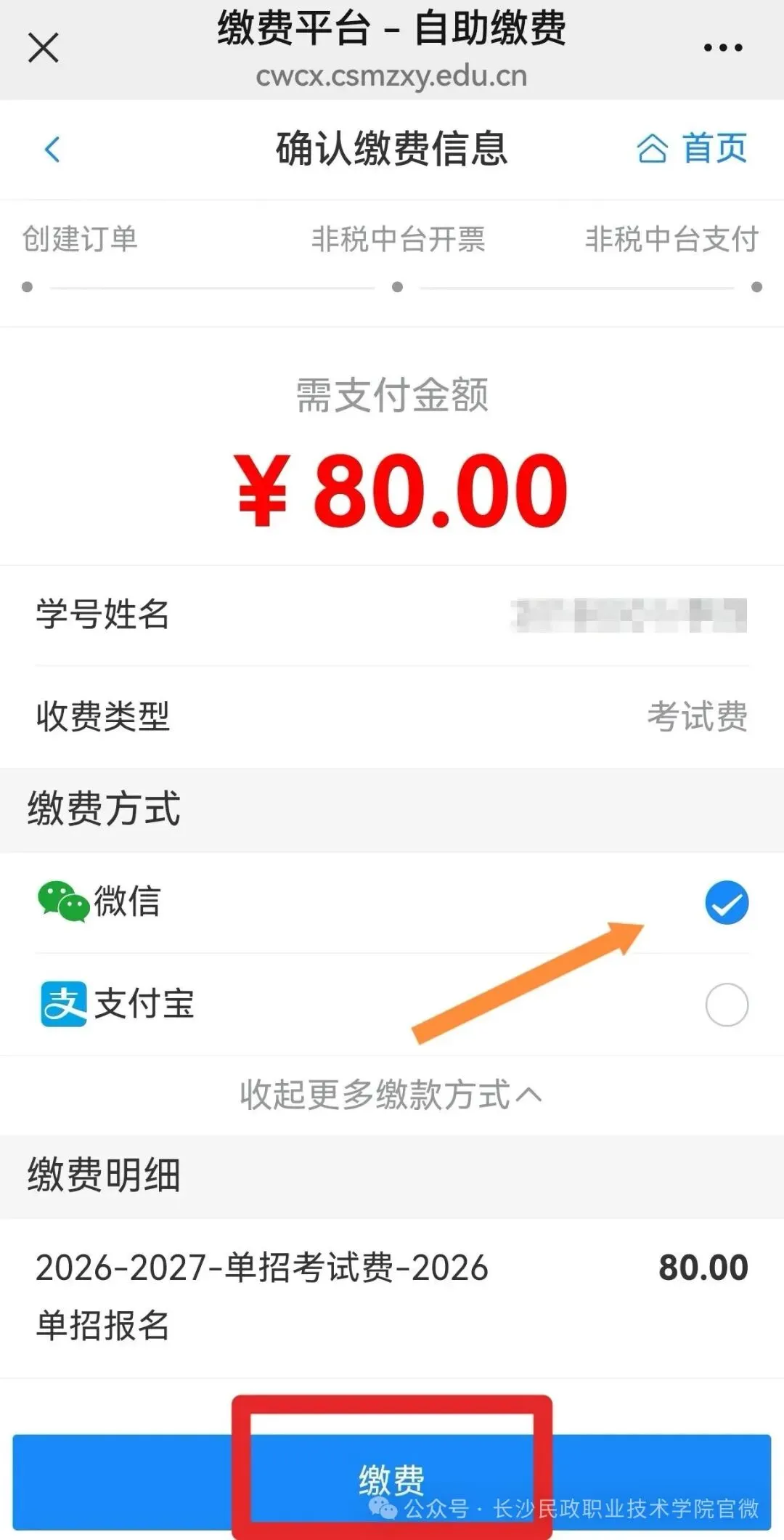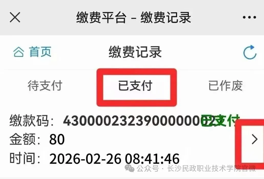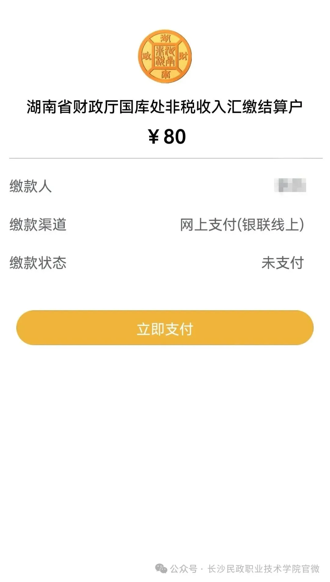 1.学生可扫码关注“长沙民政职业技术学院官微”微信公众号,在公众号页面,点击下方的“信息服务”中的“缴费平台”菜单,进入缴费登录页面。点击箭头,输入身份证号、姓名、验证码,登录主页面。