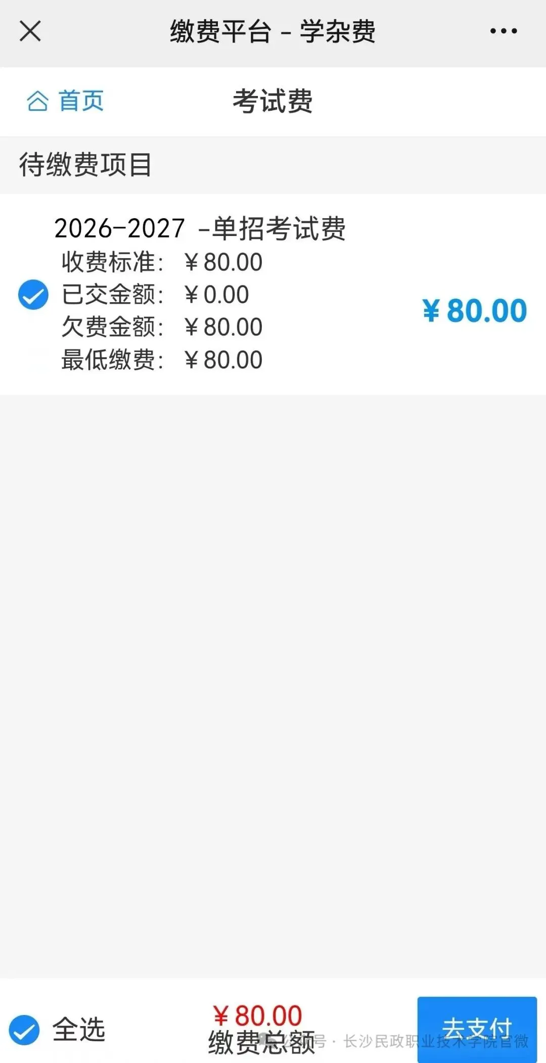 2.登录成功之后进入主页面,点击“考试费”入口,进入“考试费”缴费页面。确认缴费项目和金额信息选择无误之后,点击右下角“去支付”,跳转到订单页面。