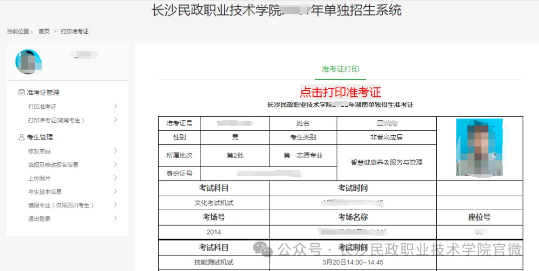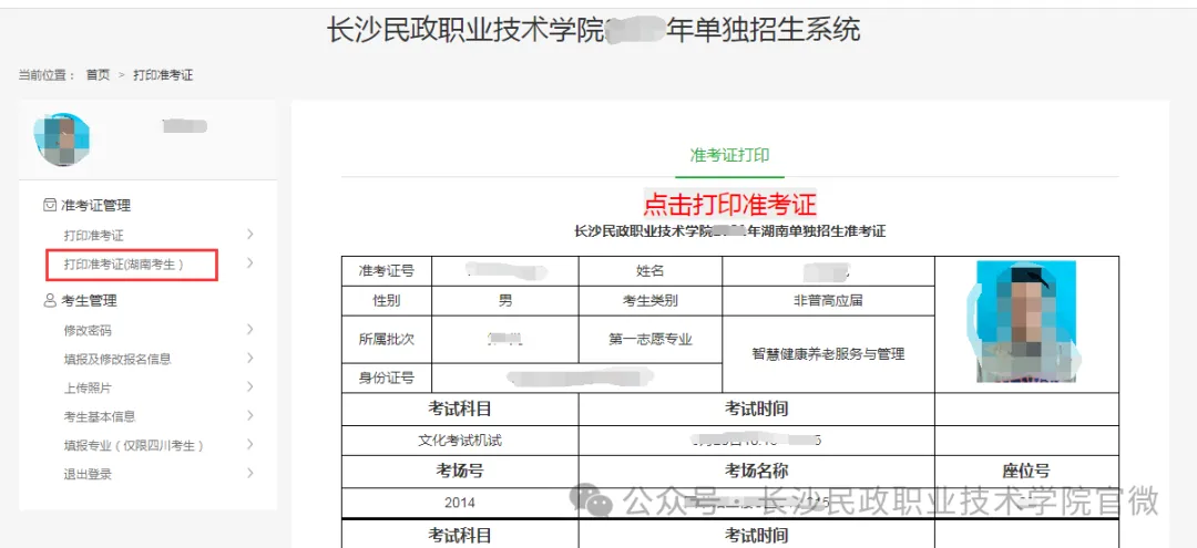 3.预览准考证。点击“准考证管理”-“打印准考证(湖南考生)”,系统自动生成准考证。请考生注意查看准考证信息是否准确,如有疑问可与我校招生就业处联系,联系电话:0731-82763288。