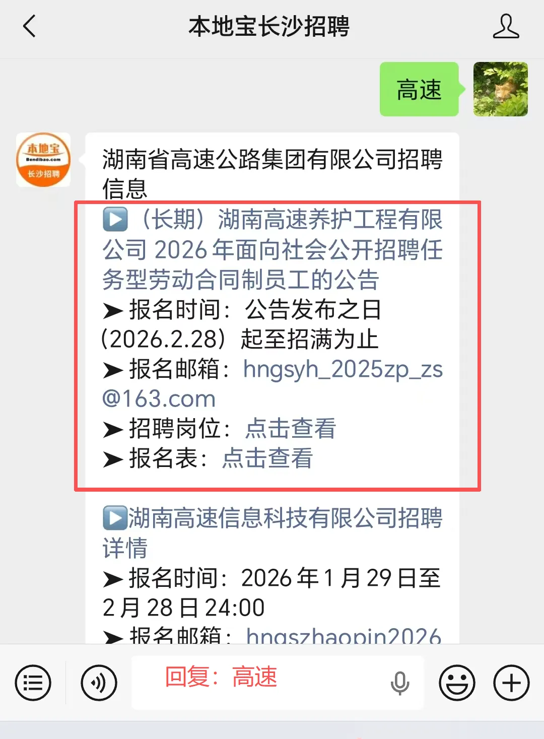 扫描下方二维码关注【本地宝长沙招聘】,关注后对话框回复【高速】可获湖南省高速公路集团招聘公告,岗位表、报名表、报名入口、咨询电话等相关信息。