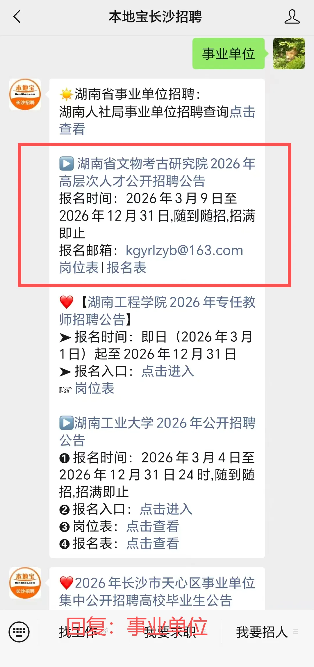 搜索关注【本地宝长沙招聘】,关注后对话框回复【事业单位】可获事业单位招聘公告、完整岗位表、报名表、报名入口、咨询电话等相关信息。
