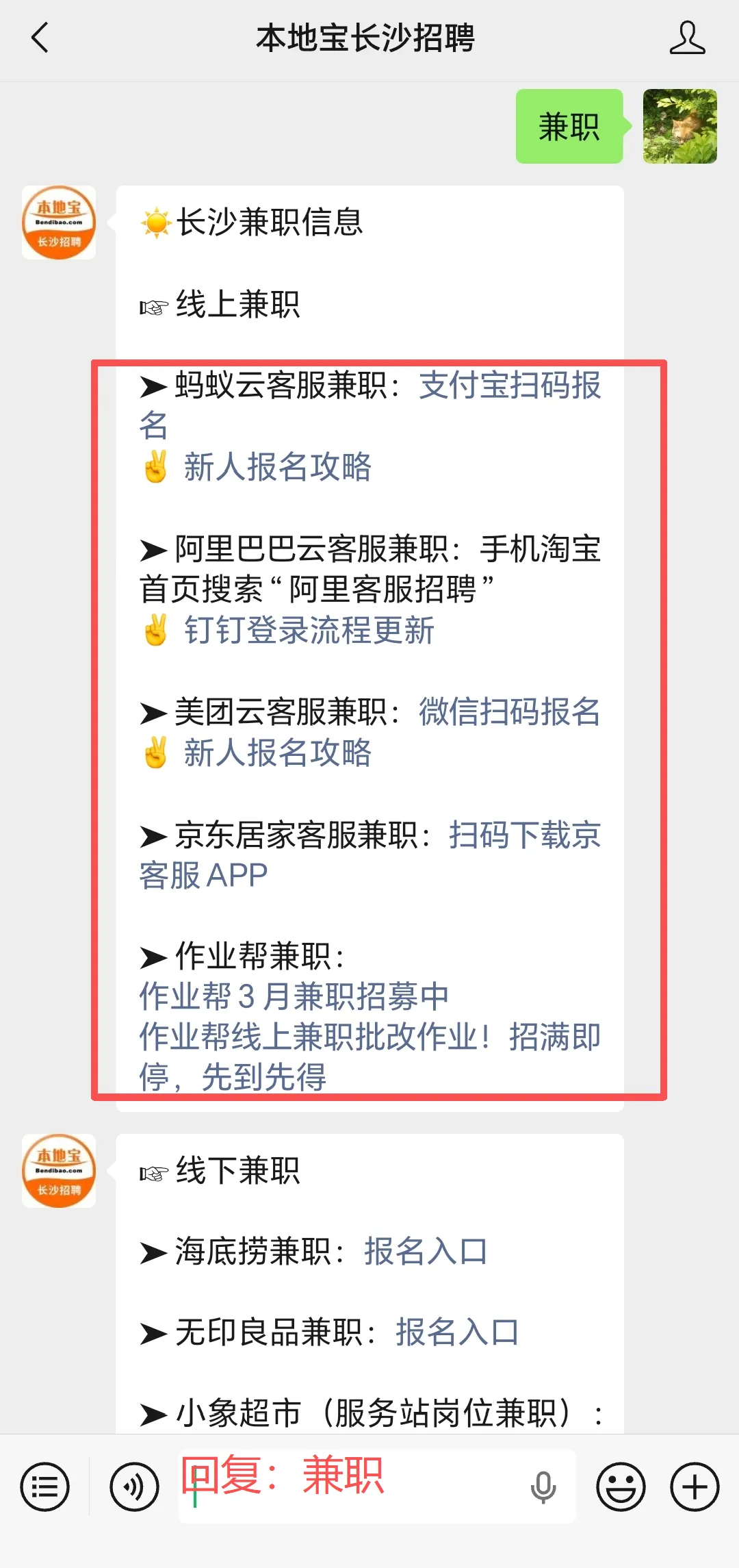 美团云客服小程序,或者您可以扫描下方二维码,关注【本地宝长沙招聘】公众号,回复【兼职】,即可直达各大平台线上线下兼职报名入口,查看最新兼职岗位消息。(本地宝仅提供报名入口,非主办方)