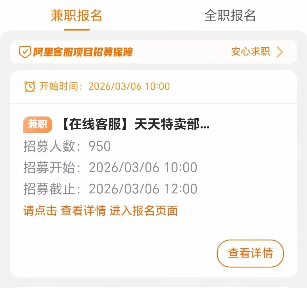 报名方式:手机淘宝APP首页搜索“阿里客服招聘”-点击“客服招聘”,进入客服招聘小程序,查看当期招募计划,如下图所示