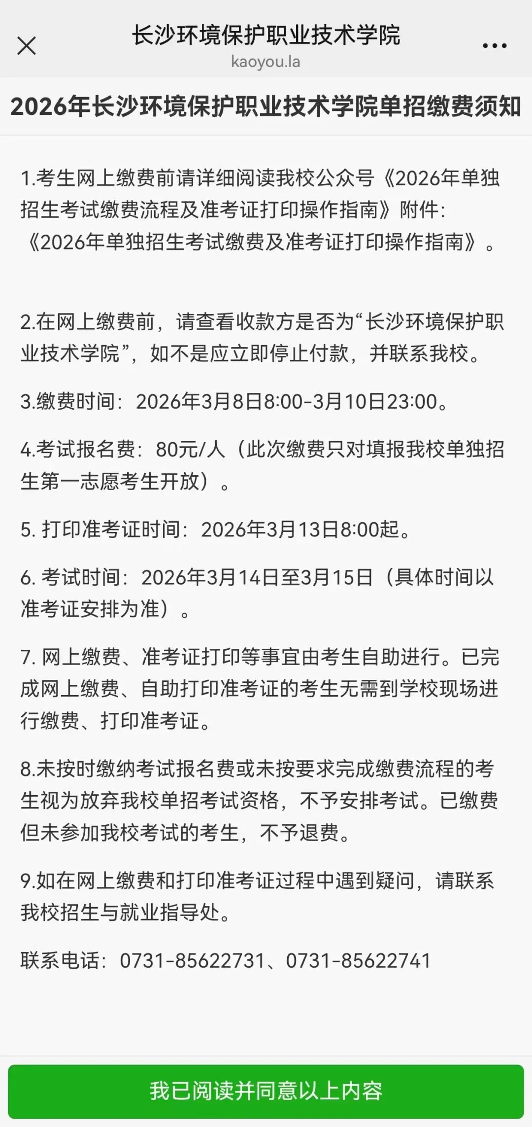 长沙环境保护职业技术学院2026年单独招生考试缴费及准考证打印具体操作如下: