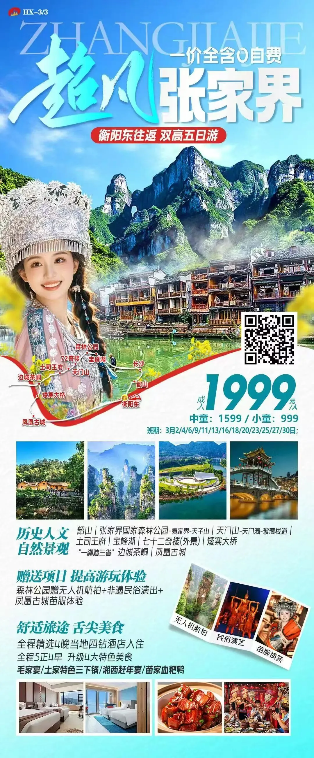)韶山,是中国人民的伟大领袖毛泽东的故乡,也是毛泽东青少年时期生活、学习、劳动和他早期从事革命活动的地方。景区历史源远流长,古属荆楚,因舜帝南巡至此演奏韶乐而得名,区内钟灵毓秀,风光旖旎,人文景观和自然景观交相辉映;参观韶山冲上屋场的【毛主席故居】观赏伟人曾用过的日常器皿和主席少年时期用过的扁担、水桶、锄头等各种农具以及毛泽东从事革命活动的文物照片和资料;后前往【毛泽东铜像广场】,瞻仰毛主席开国大典铜像,观看并听取关于铜像设立时出现的“日月同辉”和提前三个月开放的“杜鹃花开”等神奇录像与故事,感受一代伟人的骄人风采和朴素之风,在主席庇佑地许下完美心愿!客人可向毛主席敬献花篮,向主席行礼,缅怀一代伟人!故居属于国家一级红色保护5A景点,凭有效证件免费预约参观,每天预约人数有限,需提前进行预约,按出发日期提前5-7天报名的客人将给予统一进行预约,离出发日期5天内报名的客人,将协助预约门票,参观故居排队时间以现场实际人数为准,仍不能避免的客观事件或不可抗力因素导致未预约到故居门票,则改为外部游览参观,无费用可退(每逢重要节假日,这里游客的数量会增加许多,每逢有重要领导人前来参观时,景点可能会停止对外开放);午餐后游览【天门山国家森林公园】(含门票和进山大索道费用,玻璃栈道鞋套+天门洞扶梯赠送,游览时间约5.5小时)乘坐“世界第一长高山客运索道”,索道全长7455米,海拔1279米,体验腾云飞翔的刺激震撼,登张家界之巅云梦仙顶,俯瞰张家界全景,俯瞰九十九道弯的公路奇观【通天大道】;游览【鬼谷栈道】,在悬崖上欣赏风景,带着急促的心跳,脚下是没有边际的绿野,伸开双臂,你就能得到一次最完美、最刺激、最贴近自然的完美SPA;还有惊险刺激的悬空【玻璃栈道】挑战你的高空极限,观赏奇妙美丽的盆景花园,游览盆景石区,山体孤峰高耸,气势临空独尊,世界最优秀的翼装飞侠杰布·科里斯的惊天挑战也曾在此举行;游览悬于千寻素壁之上的天然穿山溶洞【天门洞】,南北对开,气势磅礴,巍峨高绝,是罕见的高海拔穿山溶洞,更是尽显造化神奇的冠世奇观,从而拥有终身难忘的旅游体验。①、天门山景区需提前5天预约,一经预约成功,不退不改,门票损失自行承担。游览时间由景区决定,我社将根据预约时间调整游览顺序,谢谢配合!②、天门山分3条上下山线路:中间无任何门票差价可退,报名敬请须知!天门山分3条上下山线路:A线票(大索道上-快线索道下)B线票(快线索道上-大索道下)C线票(快线索道上-快线索道下)价格同等,由景区统一安排分配线路,旅行社无法自主选择其中一条线路,最终解释权归天门山景区所有;游览结束后乘车前往网红地标吉尼斯最高土家吊脚楼-72奇楼,参观宏伟外观夜景,传承土家族千年建筑工艺,守正创新,大器天成,犹如一座丰碑,傲立在张家界三千奇峰之巅,八百秀水之畔,见证民族文化新传奇!第三天:宝峰湖→张家界国家森林公园→大型非遗湘西民俗演艺早餐后乘车前往游览世界自然遗产【宝峰湖】(门票已含,游览时间约3小时,环保车+游船赠送),地处张家界武陵源风景名胜区的核心地带,距武陵源区政府1.5公里,被称为“世界湖泊经典”,宝峰湖风景区集山水于一体,融民俗风情于一身,尤其以奇秀的高峡平湖绝景“飞流直下三千尺”的宝峰飞瀑、神秘的深山古寺闻名,宝峰湖主要景点由宝峰湖和鹰窝寨两大块组成。其中宝峰湖、奇峰飞瀑、鹰窝寨、一线天被称为武陵源“四绝”,探索“世界湖泊经典-宝峰湖”见识“飞流直下三千尺”的宝峰飞瀑!后赴中国第一个国家森林公园【张家界国家森林地质公园】,乘【天子山索道】(天子山索道单程赠送)上山,游览张家界峰林之王【天子山景区】,天子山是湖南旅游最重要的组成部分,是张家界旅游的代名词,是张家界旅游不可缺少的最精华景点,游览天子阁、仙女献花、御笔峰、贺龙公园等景点;后乘环保车前往游览【袁家界核心景区】《阿凡达》外景拍摄地--哈利路亚山,探寻影视阿凡达中群山漂浮、星罗棋布的玄幻莫测世界;参观云雾飘绕、峰峦叠嶂、气势磅礴的空中绝景;山下漫步天然大氧吧【金鞭溪】(精华段):杉林幽静,穿行在峰峦幽谷云间,溪水明净,人沿清溪行,胜似画中游,这是一条观赏性与自娱性结合的旅游线路,十里长溪,山回路转,一步一景,十步一重天,小溪潺潺的流经你的脚下,似琵琶,似古筝,时而丁冬悦耳,时而涓涓小吟···晚上赠送欣赏湘西非遗演艺《魅力湘西》(如遇景区提质改造或疫情影响等不可抗力因素造成无法正常演出以及个人原因取消等,赠送项目不游不退)“游张家界绝美山水,赏冯小刚民俗大戏”将成为张家界旅游的经典组合!它是目前为止中国唯一一个被列入文化遗产的训练基地。在这里您可以享受到历史悠久的土家文化、苗族文化、白族文化等多民族文化;①、请穿着舒适的运动鞋或登山鞋,方便长时间行走和攀登,根据季节选择合适的衣物,春季和秋季气候宜人,但早晚温差较大,需备一件外套;夏季较为炎热,可穿透气轻薄的衣物,同时做好防晒措施;冬季寒冷,要穿厚棉衣、羽绒服等保暖衣物。②、张家界国家森林公园的猴子多为野生猕猴,它们长期在景区活动,与游客接触频繁。但这些猴子野性犹存,具有一定攻击性,请不要做出如故意逗弄、扔石子、抢夺其食物等激怒