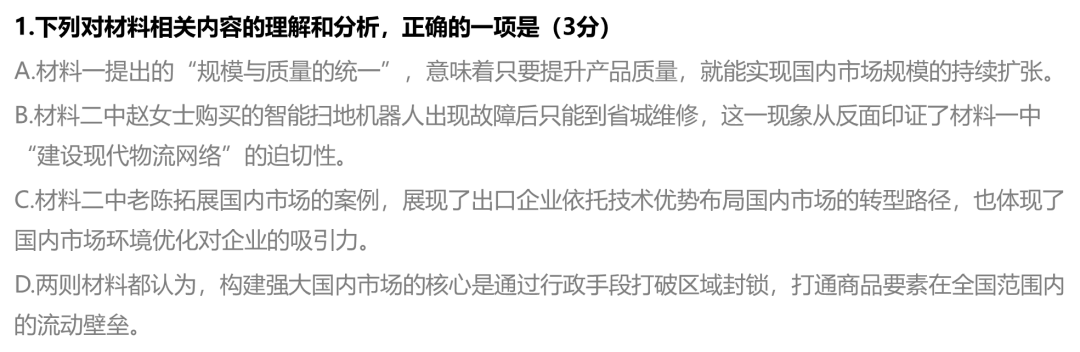 1. C【解析】本题主要考查考生对文本信息的理解和分析能力。A项,“只要……就……”表述绝对化。材料一指出“规模的持续扩张需要以质量的系统提升为支撑”,说明“提升质量”是“扩张规模”的必要条件,而非充分条件,规模的持续扩张还需依赖收入分配、消费环境等多重因素。B项错误,概念偷换。赵女士的烦恼是“售后维修网络覆盖不足”,而材料一中的“现代物流网络”侧重商品的运输配送,二者范畴不同,不能相互印证。C项,老陈凭借出口代工积累的技术拓展国内市场,体现了庞大的国内需求对产业升级的推动作用,契合材料一“本土市场效应”理论;同时“两条腿走路”(内外销兼顾),正是材料一强调的“内生动力与对外开放良性互动”的实践体现。D项,错误有二:一是“核心是通过行政手段打破区域封锁”以偏概全,材料一指出构建强大国内市场“具有三个维度的深刻内涵”,并且需要协同推进三个方面的深层次改革即“收入分配、流通体系、消费环境”。“打破区域封锁”只是第二个维度“统一性与差异性的有机结合”中的一环。二是“两则材料都认为”无中生有,材料二聚焦消费场景与市场现象,未提及“行政手段”相关内容。