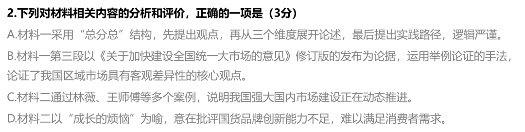 2. C【解析】A项,结构误判。材料一采用“总—分”结构,结尾是对实践路径的论述,未形成“总—分—总”闭环。B项,论据与论证观点的对应关系错位。《关于加快建设全国统一大市场的意见》修订版的引用,是为了论证“强大国内市场建设需坚守统一性”的观点,是支撑“统一性”的政策事实论据;而“区域市场具有客观差异性”是后文用“但同时”转折后的补充观点,并非该论据要论证的内容。D项,意图曲解。“成长的烦恼”指市场扩张带来的阶段性挑战,并非批评国货创新能力不足。