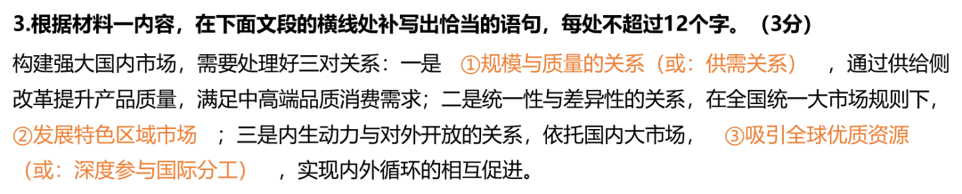 【解析】本题考查对材料核心观点的提炼与整合能力。①处对应材料一“规模与质量的统一体”(填“供需关系”亦可,对应材料一“解决长期存在的供需结构性错配问题”);②处对应“尊重区域特色,形成优势互补、各具特色的区域市场生态”;③处对应“通过更高水平的制度型开放,吸引全球优质资源要素,深度参与国际分工”。
