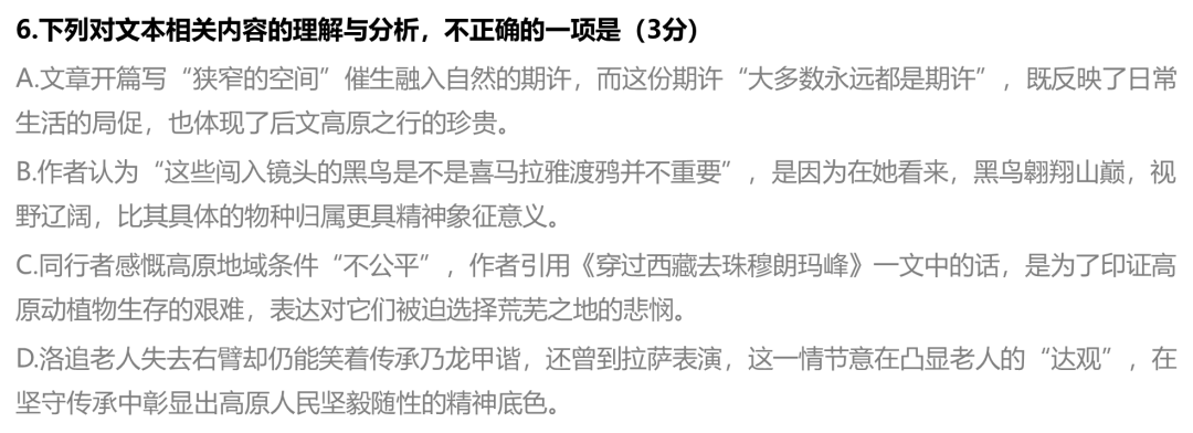 6. C【解析】本题主要考查学生对文本细节的比对能力及对作者写作意图的分析能力。作者引用这段话,并非单纯表达“悲悯”,而是为了引出后文对“地理位置就是命运”的思考————生命会适应所处的环境,无论是动植物还是人,都能在看似严苛的土地上找到生存的方式。选项中“被迫选择”“悲悯”的情感倾向,与原文“适应这里融入这里”的内核相悖,属于对作者写作意图的误判。