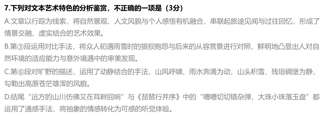 7. D【解析】本题主要考查学生对散文表达技巧鉴赏和文本艺术效果的分析能力。“远方的山川仿佛又在耳畔回响”中的“远方的山川”可以是记忆中的视觉景象,并非“抽象情感”。另外,《琵琶行并序》中“嘈嘈切切错杂弹,大珠小珠落玉盘”的对象是具象的声音,并非抽象的情感。此句是听觉转化为视觉,将琵琶声的听觉体验转化为珠玉落盘的视觉画面。同时,该句还包含“以声写声”的效果,以珠子落玉盘的声音模拟乐声的清脆圆润。