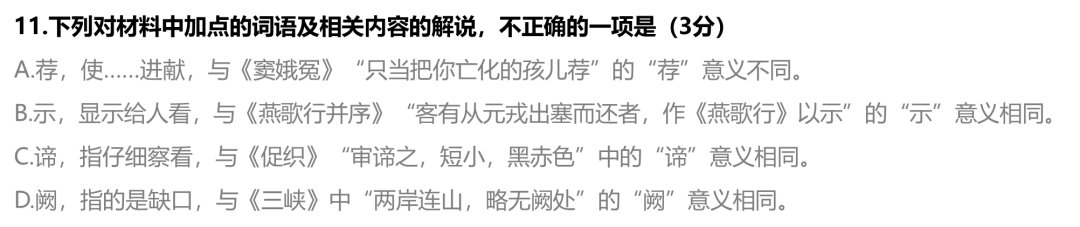 11. D【解析】A项,“荐”在“穆王荐之”中是“使……进献”的意思,即表达穆王召见偃师。“荐”在“只当把你亡化的孩儿荐”中意思是“祭奠”的意思。二者意义不同。选项正确。B项,“立剖散倡者以示王”与“作《燕歌行》以示”的“示”都意为“显示给人看”。选项正确。C项,“王谛料之”的“谛”是动词,意为仔细察看,与后面的“料”连用强化了细致查验的含义;《促织》“审谛之”中“谛”为动词(细察看)。二者意义一致。正确。D项,“两山对如阙”的“阙”指宫门两侧的高台,“如阙”是一种比喻用法,本句意为“两座山峰相对峙,如同宫门两侧的楼台”。“两岸连山,略无阙处”的“阙”意为“缺口”。二者意义不同。故错误。