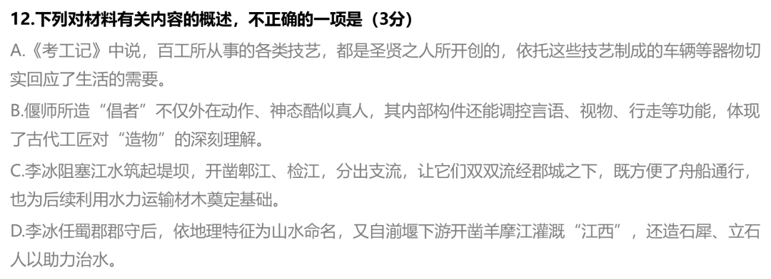 12. D【解析】B项,材料二中“瞬其目”为“倡者”的体现,即用眼神挑逗。D项,“自湔堰下游开凿羊摩江”错误,原文明确为“乃自湔堰上分穿羊摩江”,是“上游”,不是“下游”。