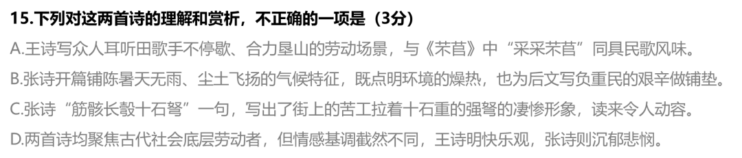 15. C【解析】本题考查学生对诗歌的综合理解和赏析的能力。“一石”相当于120斤,劳工拉着十石重的弓弩根本不现实。诗句中的“十石弩”并非实指劳动者需要拉动强弩,而是以“拉满十石弩时的紧绷状态”来写劳动者因长期负重劳作,筋骨时刻处于僵硬紧绷的状态,这属于比喻修辞而非实写劳作内容,而选项将比喻对象误解为实际劳作任务,故为错误选项。