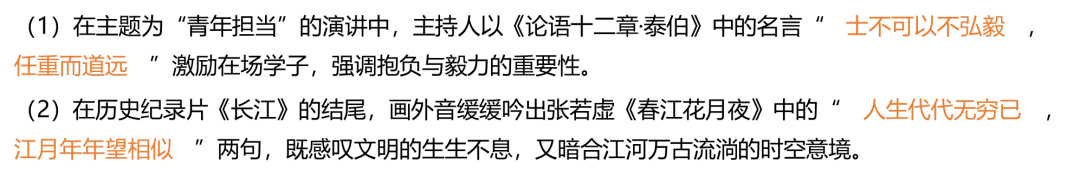 《赤壁赋》江水:(共2分)答出“表达超然豁达”/“化解了前文‘哀吾生之须臾’的悲叹”,即可得1分,结合诗句分析得1分。如有其他答案言之成理亦可酌情给分。