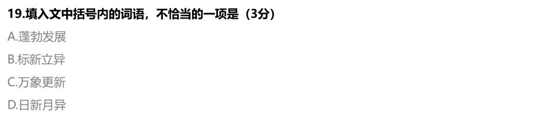 19.B【解析】语境强调社会生活变化快,不断涌现新事物、新现象、新概念,需要大量的名词对其进行指称。A项,“蓬勃发展”指事物发展的势态迅速、积极、向上。广泛应用于描述社会经济、新兴产业及绿色低碳产业等领域的发展态势。符合语境。B项,“标新立异”指提出新奇的主张,表示与一般不同。不合语境,错误。C项,“万象更新”指事物或景象都改换了样子,出现一番新气象。符合语境。D项,“日新月异”指每天每月都有新的变化,形容进步、发展很快。符合语境。