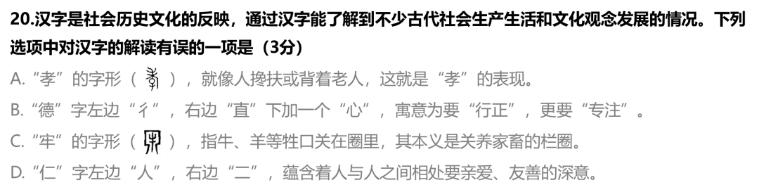 20.B【解析】本题考查学生理解汉字文化内涵的能力。“更要‘专注’”错误。“德”字是会意兼形声字。左边是“彳”(chì),它在古文字中多表示“行走”之义;右部上面是“直”字,二者相合就是“行得要正”;下面加一颗“心”,即除了“行正”外,还要“心正”,可见人们对“德”字的含义标准要求之高。