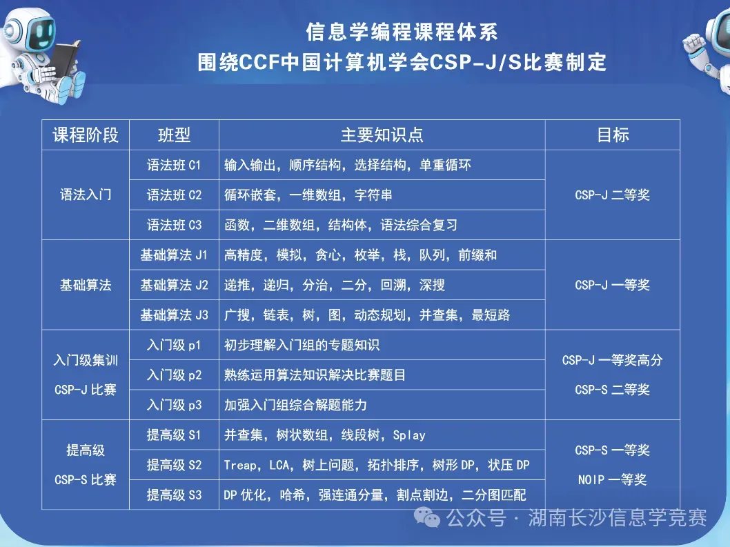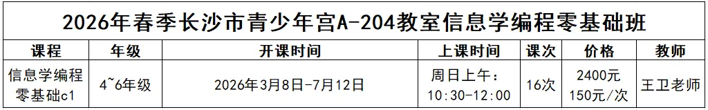 即日起,长沙市青少年宫“名师来了”教学团队信息学奥赛编程课程面向青少年开放春季班报名!课程设置涵盖:c++信息学编程启蒙、c++信息学编程语法、c++编程算法1、c++编程算法2、c++编程算法3 信息学编程启蒙班(零基础)可以直接报名,其余班级需要联系王卫老师测试c++编程后报名对应班级,编程零基础启蒙班一次课为2课时,后续进阶班课时为3课时,报名请咨询:18529584415 王卫老师)信息学奥赛全称“全国青少年信息学奥林匹克竞赛”,和数学、物理、化学、生物一并为中学生五大竞赛,是最能体现孩子们编程能力、算法能力且具有含金量的编程赛事之一。零基础班级课程从0开始教授信息学c++编程语法知识,逐步构建信息学知识体系与竞赛能力。零基础前三次课为试听课,第四次课我们会收费16次课2400元(包含前三次课的费用),三次课后的后续课程不愿意参加则前三次试听课免费试听.