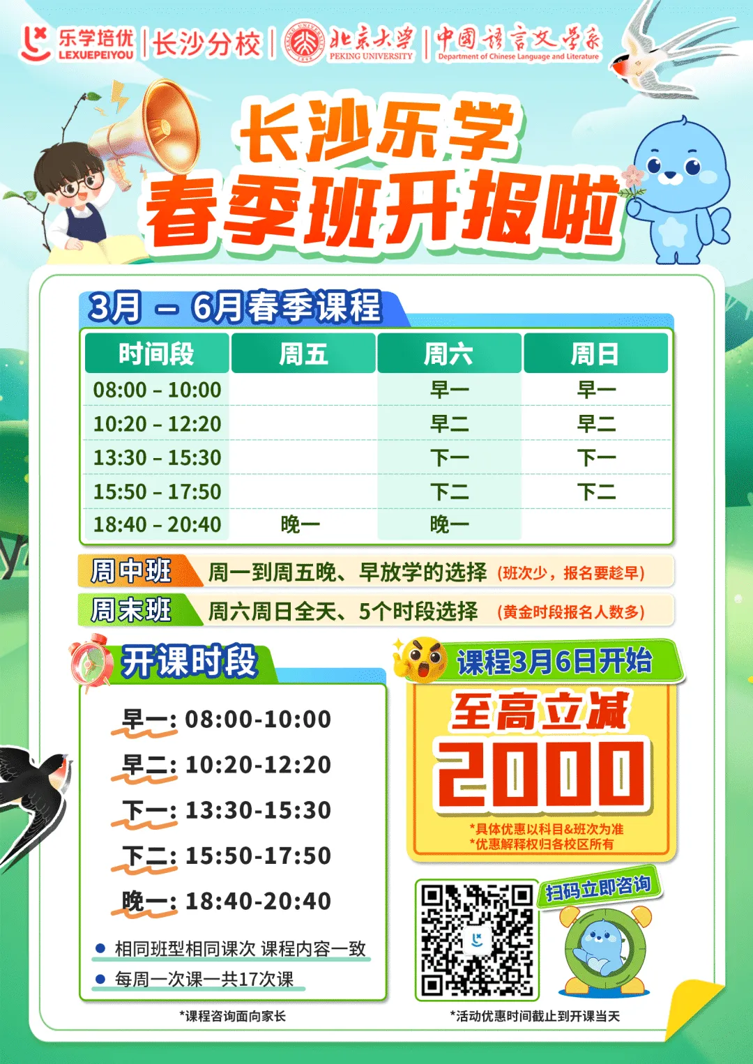 🏫 5个时段|早一至晚一|每周一次课一共17次课