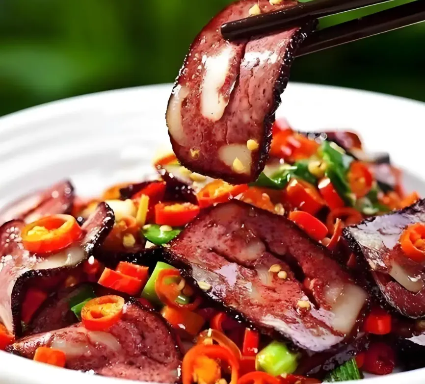 这不是普通的丸子。豆腐捏碎,淋上新鲜猪血,拌入肥瘦相间的猪肉丁,加盐、辣椒粉揉匀。捏成拳头大的圆球,挂在柴火灶上熏烤。吃的时候切片,和蒜苗、辣椒一炒。外皮熏香劲道,里面软嫩鲜辣,一口下去,满嘴都是过年的味道。
