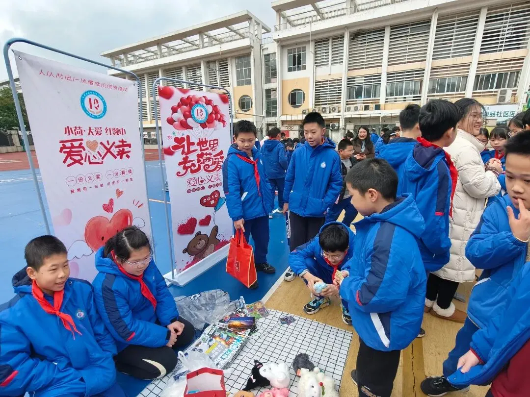爱心义卖现场人声鼎沸,学生们用零花钱购买物品,奉献爱心。