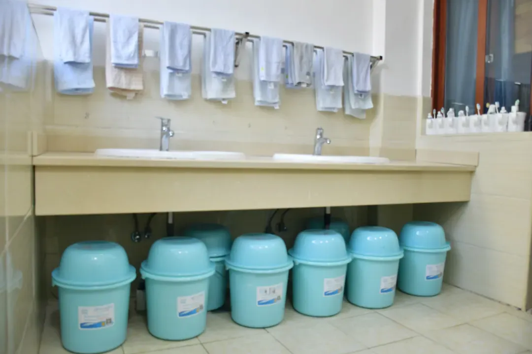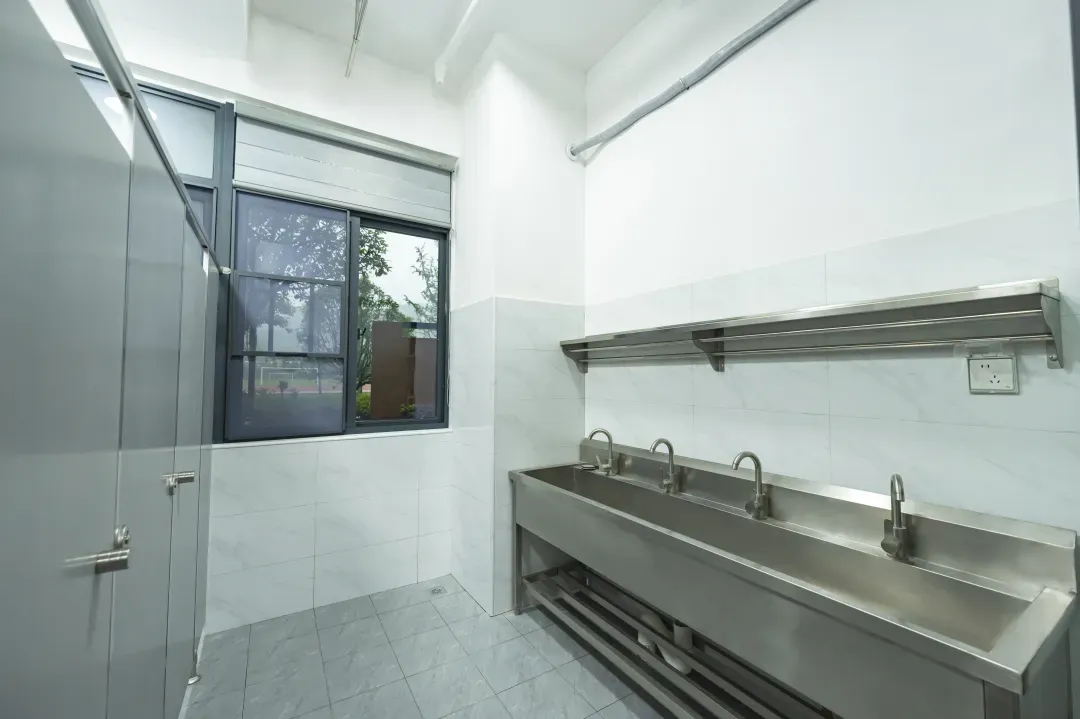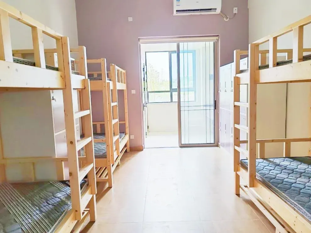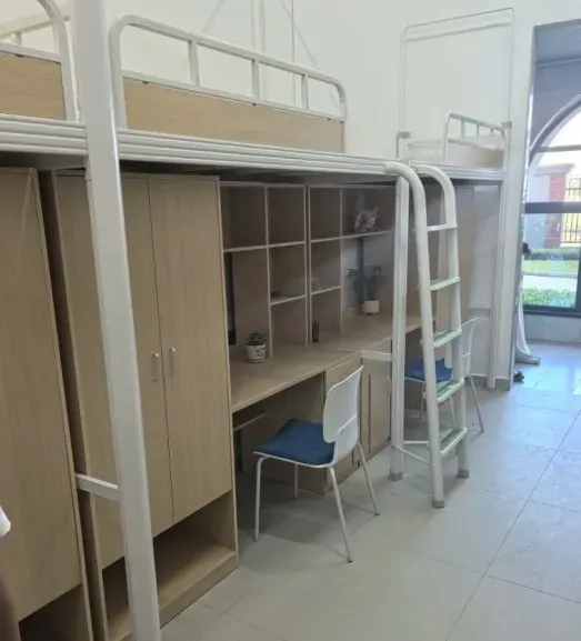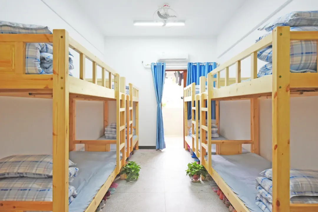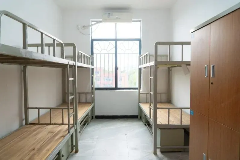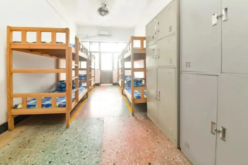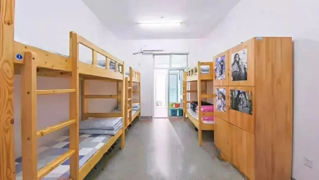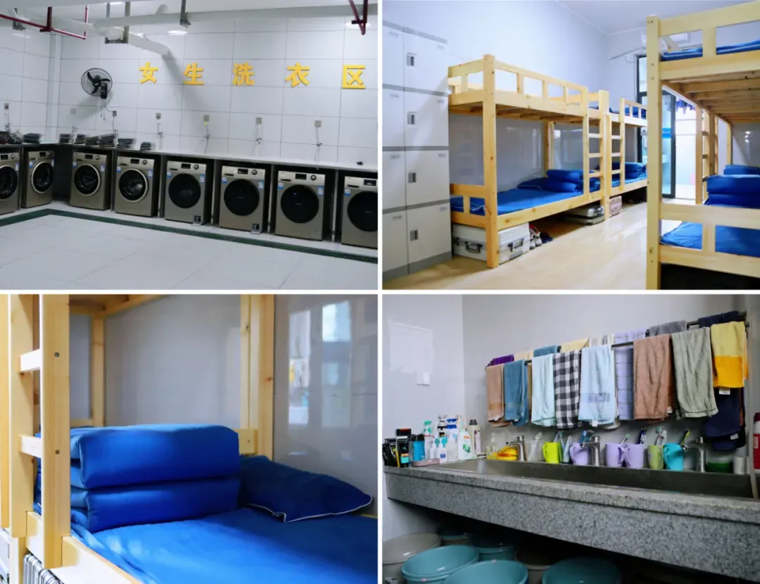 宿舍为6人/间,上下实木床,每人有一格小柜子,有两个独立卫浴间,提供24小时热水,有中央空调、洗烘一体洗衣房等设施。洗澡洗衣均按次收费,洗澡1元/次,洗衣1元/半小时,烘衣3元/次。